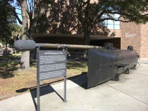 You’ve all heard of the Turtle, the first submarine. This photo is a replica of the H.L. Hunley, the first submarine to successfully sink an enemy ship, during the Civil War. So many died during trials that they were not allowed to completely submerge it during the attack. Unfortunately the vessel did not return and although it was “found” more than 20 years ago, it was not raised from off-Charleston until 2005.