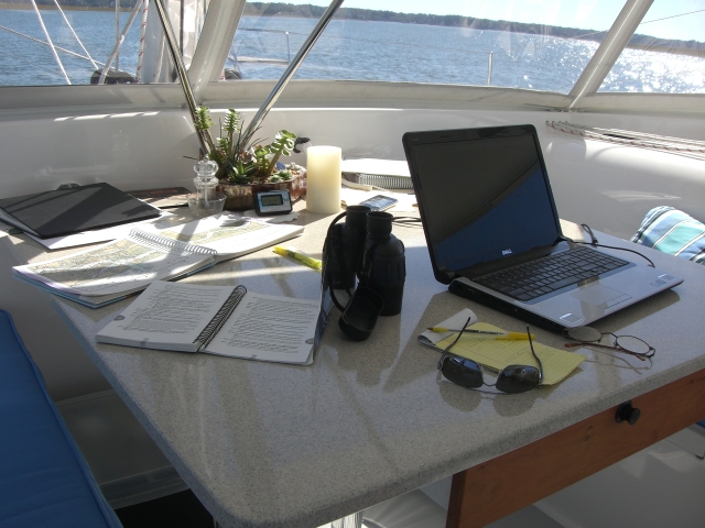 Welcome to a sneak peek into the cockpit, command central aboard Ortolan.  This shot shows the dinette fulfilling its daytime role as nav station. We have roughly two different types of traveling days; one is when we are in the ICW traveling through the dredged channel in rivers, sounds, bays and man -made land cuts and the second is non-ICW travel which was the 622 miles before reaching ICW Mile 0  at Norfolk, VA and any day we “go outside”.