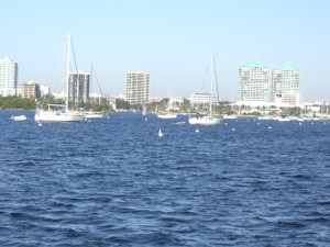 For entertainment we watched Sea Tow corral a cabin cruiser that decided to go “sailing” and leave its anchor behind. A couple daring and obviously experienced guys spent a few thrilling hours windsurfing at the far end of the anchorage. The weather and winds seem to change quickly; on Sat we actually had moments of zero wind. A sailing club that left in 10kts for a nice day’s sail in Biscayne Bay, limped back in with barely a breath of wind and several needed a tow as they got close to shore.