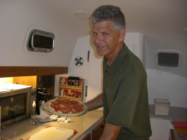 The forecast proved true and from mid-day Sunday through Tues we bobbed about on our mooring in winds averaging over 22kts and often gusting to 32! Did we get lots done, you bet. Russ kept his long-made promise to make pizza and we enjoyed a fresh California style pie for dinner Sunday night. A few tweaks and the next one will be outstanding!