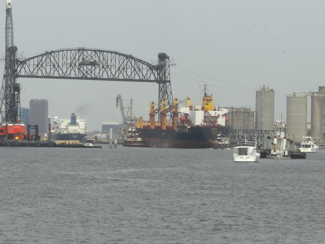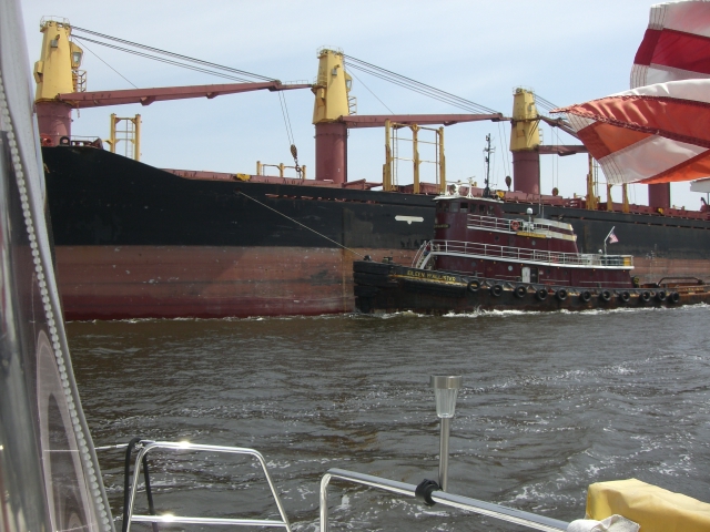 Shortly before the last bridge at Mile 6 we entered “Dances with Barges”, appearing daily in the Elizabeth River near you! The distance between the 5th and 6th bridges is six miles, so we all had nearly 10 mins to wait before the scheduled opening at the final bridge. A tug pushing a barge had just left the dock as we passed by and he came through after us; not close but well, it was a beginning. We kept ahead of him, but then came upon another tug and barge that was behind a Very Large cargo ship with two tugs in attendance. We allowed the pleasure boats ahead to run interference for us; a good time to be last in line. The Very Large ship requested the first boat in our group to stay behind, but then soon stopped to allow the cruise ship a ½ mile up river, to turn around and be on its way. By now we’re at stress level 6; it’s not like we do this all the time. Our turnoff to the marina is just a short ways past the Very Large ship and we proceed to pass the tug and barge ahead of us along with the other cruisers. The river is wide enough and plenty deep; like 40 feet. The Very Large ship continues to wait for the cruise ship who is now completing his maneuver to continue north. We push the throttles forward to 3000 rpms to make our way past Mr. Very Large… who then begins to proceed and we find ourselves mere yards away from his red hull.