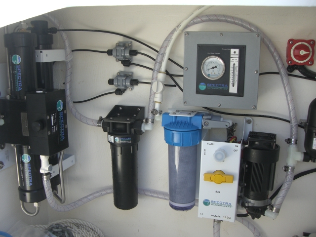 We have arrived! Masters of our domain in a significant way; able to make drinkable water from salt water. No fault of Russ’ that the project took over 5 weeks. So many pieces, tubings, switches- all have to go to the correct water tank in the correct hull and lord knows what else. When time permits (read that any way you want) Russ will post more info on the “Changes & Mods” page; for now we’ll give you a taste of our new piece of equipment.