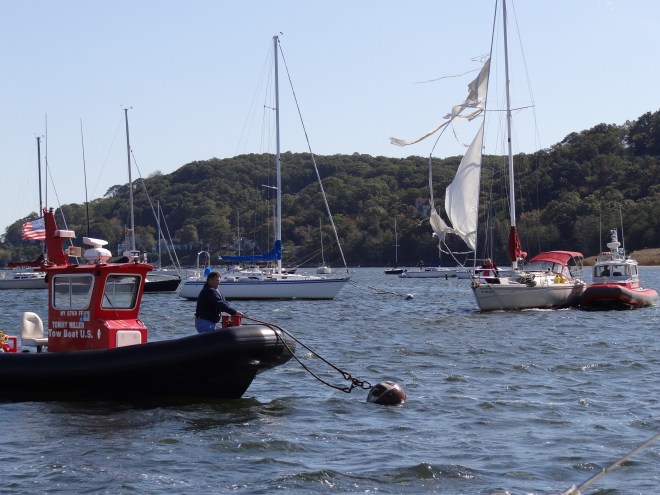 We heard about the disabled Catalina before we saw the sorry sight. Tow Boat U.S. went to assist a boat who’d lost steering and suffered a shredded jib, just outside Sandy Hook. Tow Boat wouldn’t take him anywhere under a bridge in the near gale winds, so they called the AHYC for a mooring. Guess where? Oh, that new camera is coming in handy. The mooring next to us was the assigned spot. The skipper had a cell, but no, or no working VHF. uhn, uh. Couple no-nos there.
