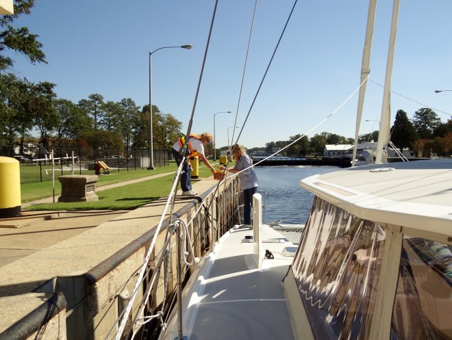 At the Great Bridge Lock, the lock tender warned the sailing vessels that the 65’ bridge at Pungo Ferry – gotta love these low country names -might have less than 65’ due to recent high winds and the gales that kept us in Atlantic Highlands. A few miles south of the Lock, we and the 44’ Hunter approached a 65 footer with no height board- sigh. As they inched closer, me watching with the binoculars, I thought for a moment they weren’t going under, but they did. I immediately hailed them on the radio to ask about their total height above the water. 64’2”- ouch that is way to close. See? Friends. We crawled under. I stood on the side deck, binoculars glued to the top of the mast. We cleared with what looked like 8” to spare. Oh boy, can’t wait for the Pungo Ferry bridge.