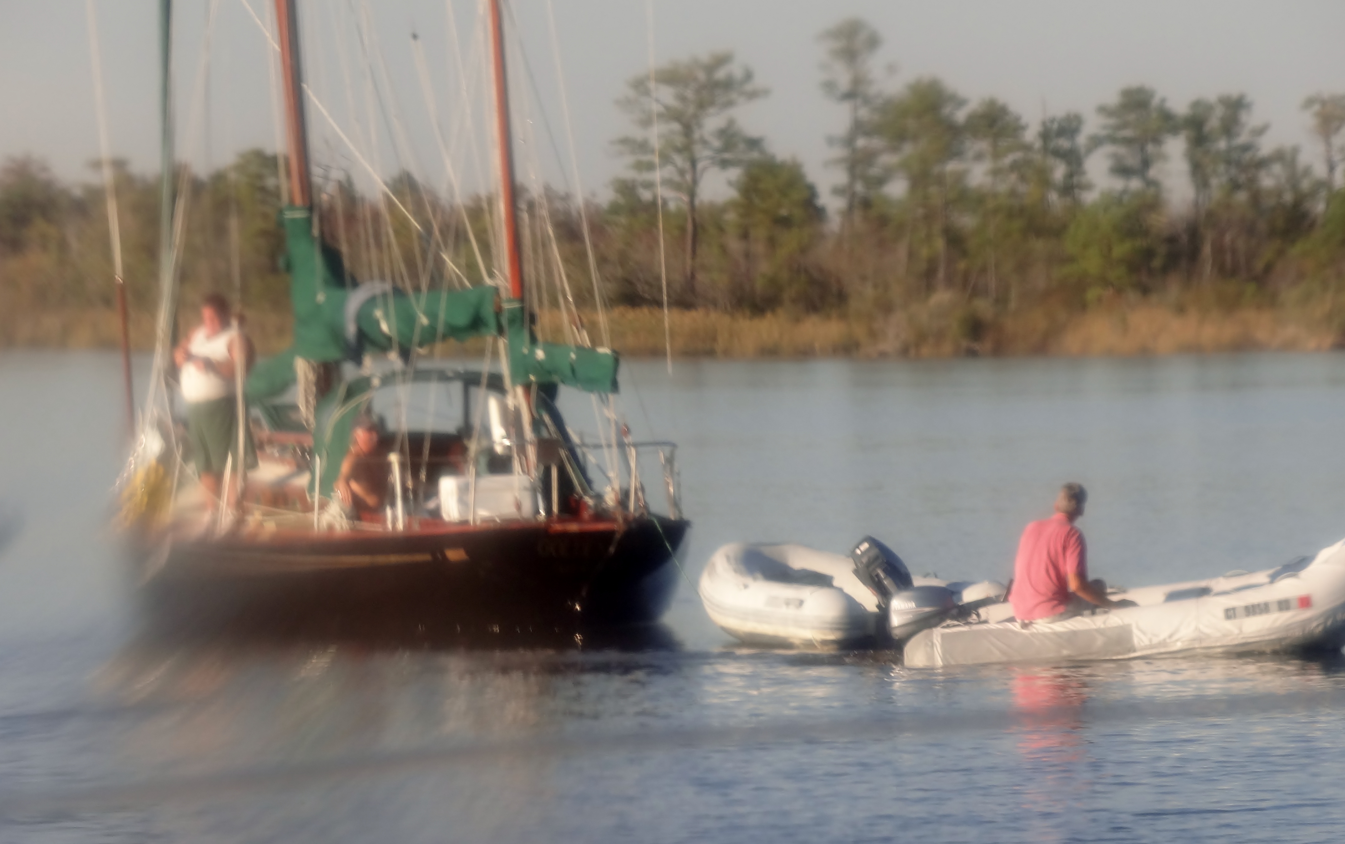Our selected anchorage for tonight was Blackwater Creek, 2 miles south of the bridge. We knew from last year that anchoring north of the bridge was only possible just off to the side of the ICW, not in any creek or bight. All shoaled or filled with deadheads and wrecks.Ugh.  As we turn the bend we see 2 sailboats anchored off to the side just before the bridge- uh oh. The one in front was a Shannon 53- motorsailer nearly as wide as Ortolan with two masts, one taller than ours. The Hunter tested the bridge and turned around. The Shannon, Moon Tide had AIS so I hailed them, no reply. As we came up, they were heading back in their dinghy and we asked about the bridge clearance. Yep- height board on this one currently displaying 63 ½ ft. We think we are 63′ plus a couple inches.