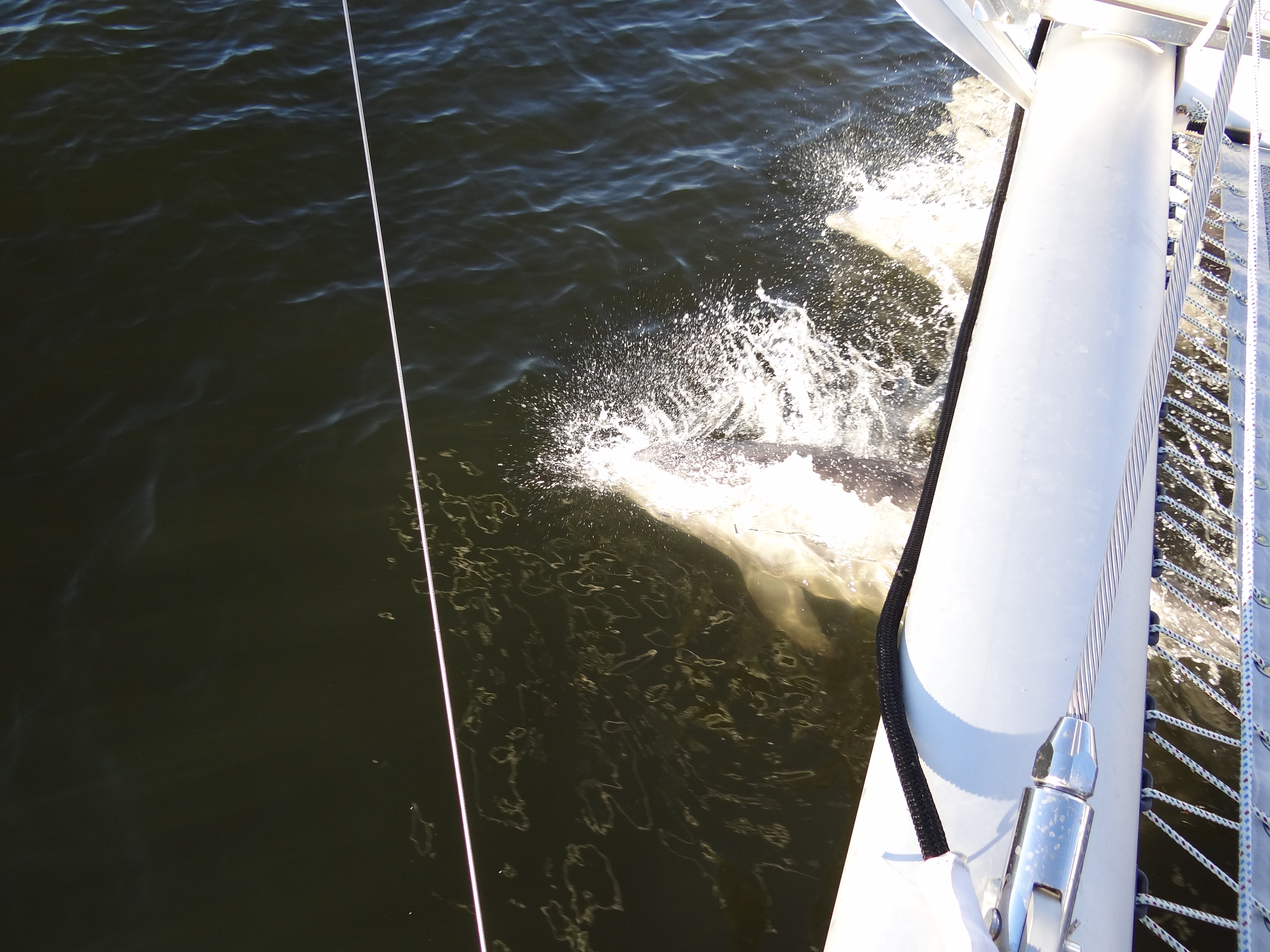 On Monday we received the OK to move south prior to Nov 1 and fortunately Tuesday was going to be a good day to cross Pamlico Sound. Seas 2-3 ft with north winds 10-20; sails up here we come! Getting caught with more sail than conditions or our comfort level permits, is worth avoiding, so when the forecast indicates more wind than 15mph we plan for more, just in case. Entered the Sound with a reef in the main, unfurled the jib and sailed along beautifully at 9 mph for 3 ½ hours. Then of course, the wind died down, we shook out the reef and shortly found ourselves motoring with no sails. Better to have reefed and not need it than need to reef- in my book. Along the way we enjoyed one of our favorite sites- dolphins having fun nearby. Spent a calm night near Swanquarter Island; a little marshy piece on the north shore. No swans in sight though.