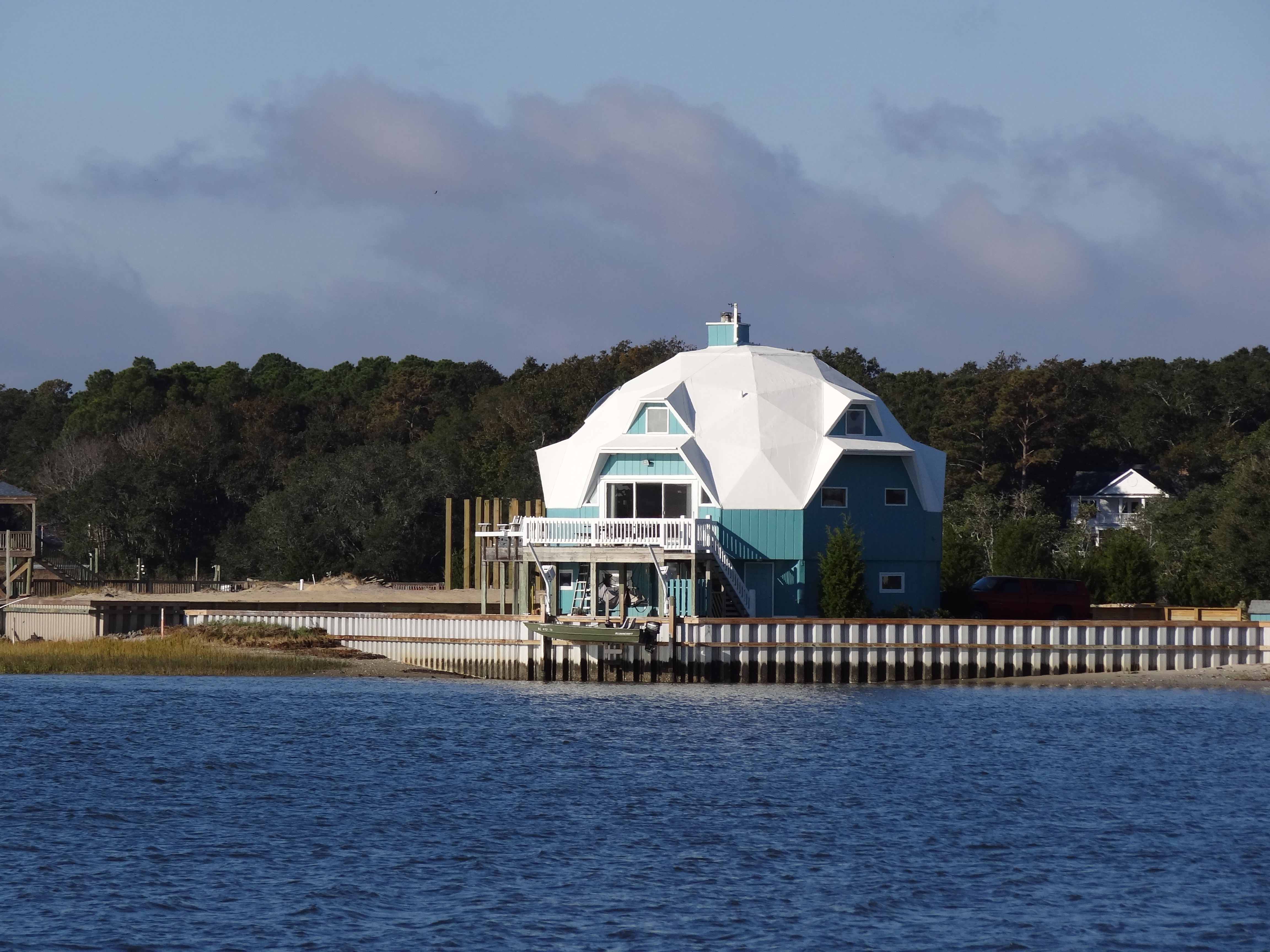 Wed night found us anchored in a small creek just off the ICW; we’d stopped at the same spot last fall and it was an easy, no problem stop. This time we had a couple other boats for company as well as Mr. Lazy Turtle lounging on a floating branch. We’d passed into South Carolina and really began to feel “southern”. Interesting houses appeared along the way and we couldn’t figure out just what bird species needed to congregate on a red roof.