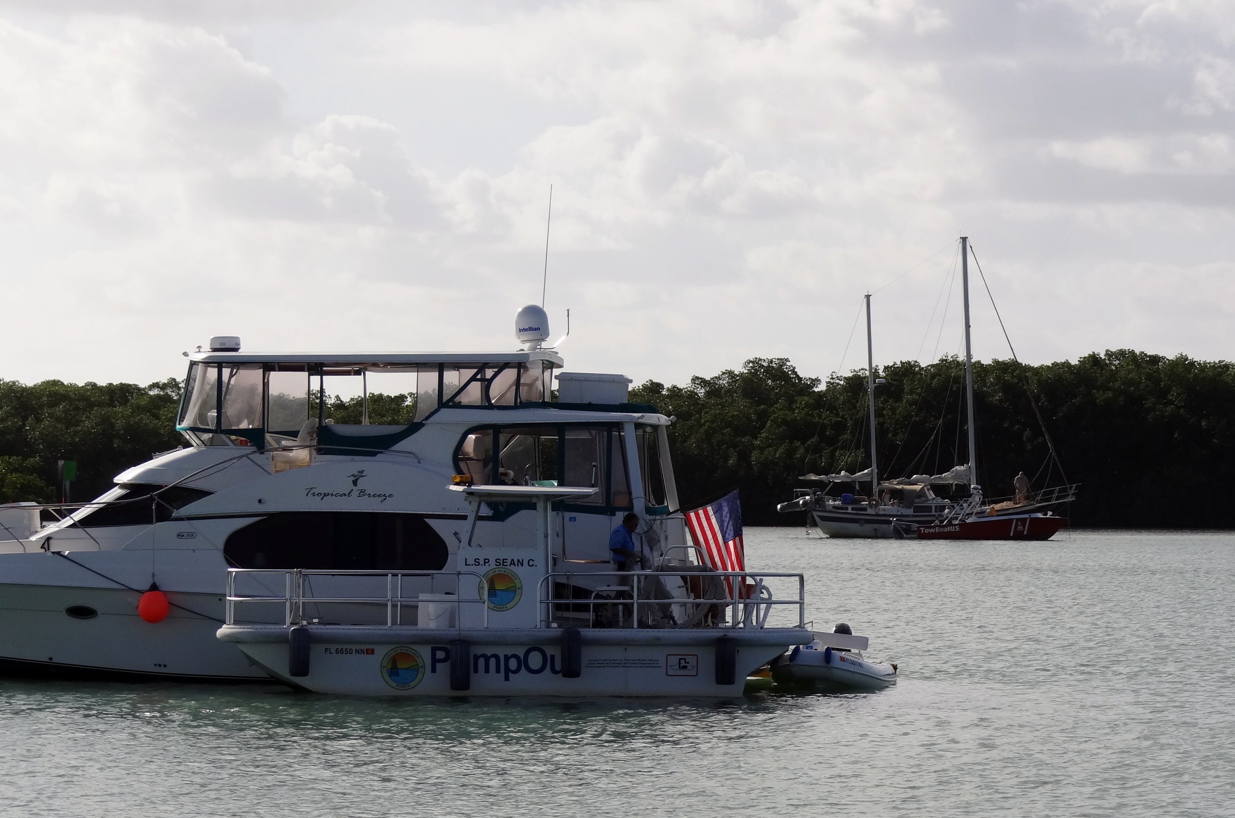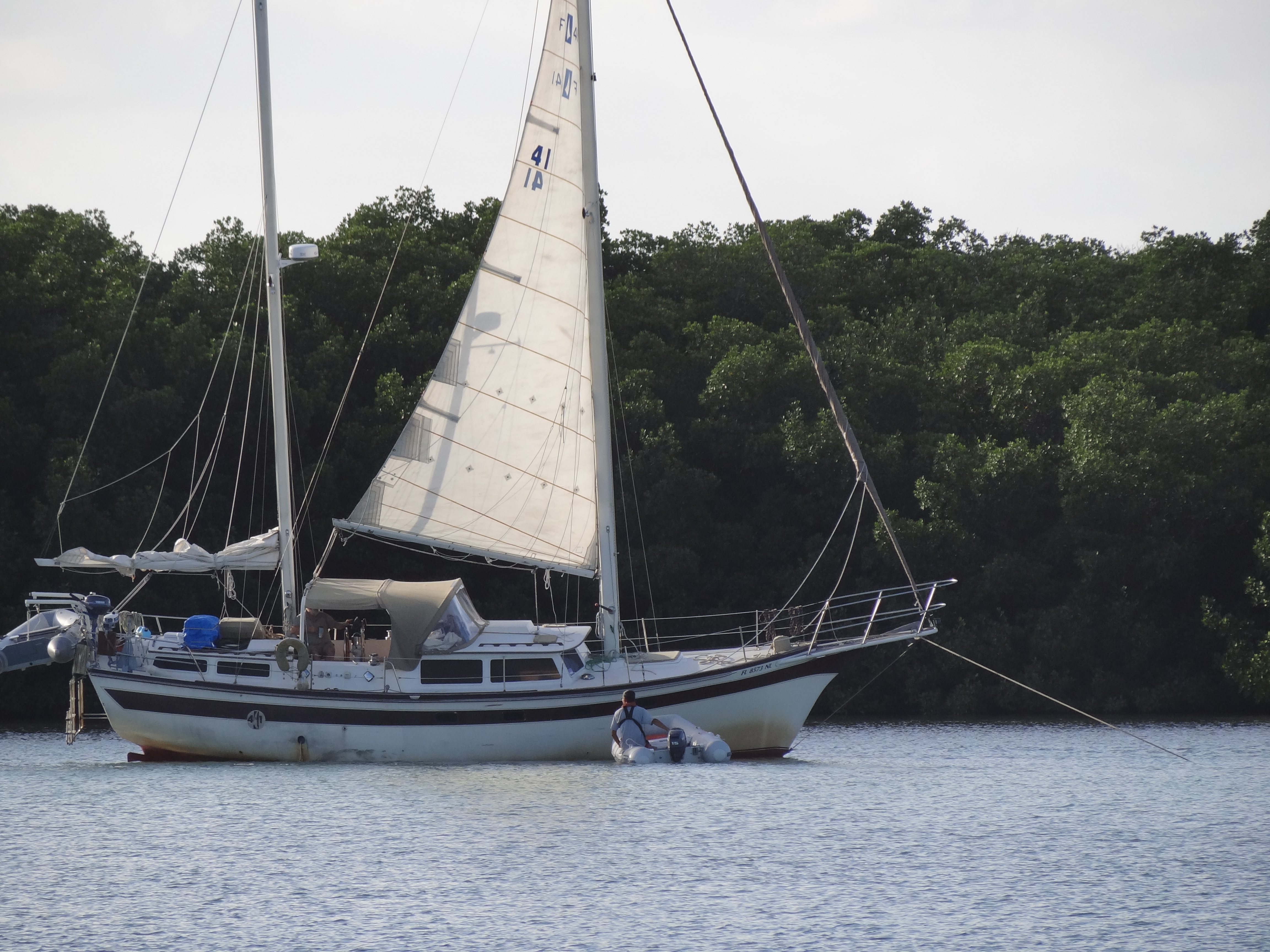 Ah, protected Boot Key Harbor, the home of so many for varying durations throughout the year. The Municipal Marina controls 229 mooring balls, all hurricane rated. The balls are regularly inspected and repaired as needed. A handout describes the three approved ways to attach your lines to the pennant. Picking up a mooring has become, dare I jinx things, a piece of cake for us ever since we acquired our super-duper stainless hook during our long stay here last Feb/March. After using the boat hook to pick up the pennant, being sure to reach through the dolphin strikers properly, I just clip the hook to the hard plastic eye of the pennant. The hook is attached to our anchor bridle which is attached to the cleats on the bows. Marinas don’t want you to use anything metal to attach yourself to the pennant, so we trade the bridle with the hook for lines that are fastened at the cleats and out to the eye of the pennant.