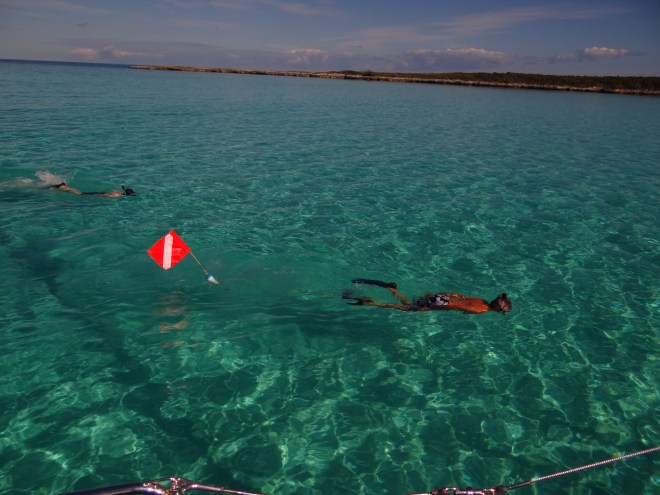 Believing is good and I’m not talking about Santa, although maybe our super easy crossing to the Bahamas was a gift from a benevolent higher power than we. Beginners’ luck at the very least. The temperamental Gulf Stream, known for its strong northerly flow and marching elephant-like waves when the wind opposes the current, was so benign for us that if not for the increase in speed (2kt current sweeping us north) we couldn’t tell we were in it. Near perfect crossing conditions favored us and made for an easy 28 hour overnight run from Long Key Bight into Great Harbour Cay Marina in the Berry Islands, Bahamas. Excitement ran high when a pod of dolphins joined us for a short swim and play visit.