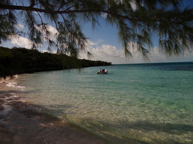 Tuesday afternoon we explored White Cay; sandy beach on the west side, rock cliffs and outcroppings on the east. We picked up a handful of sea glass, an intact sea biscuit and made faces looking at the strange gelatin-glob creatures nestled in the rock crannies; they were the aquatic equivalent to a Venus Fly Trap. As we walked along the beach to collect our stuff and thus the lonely camera, a small terrier who’d been brought ashore was barking like crazy. Took a second to realize that he was doing a couple rounds with a crab he’d dug out of its hole; the crab clearly had the upper hand- claw and finally escaped into the water. By that time I’d grabbed the camera and managed to get a couple of in-water shots.