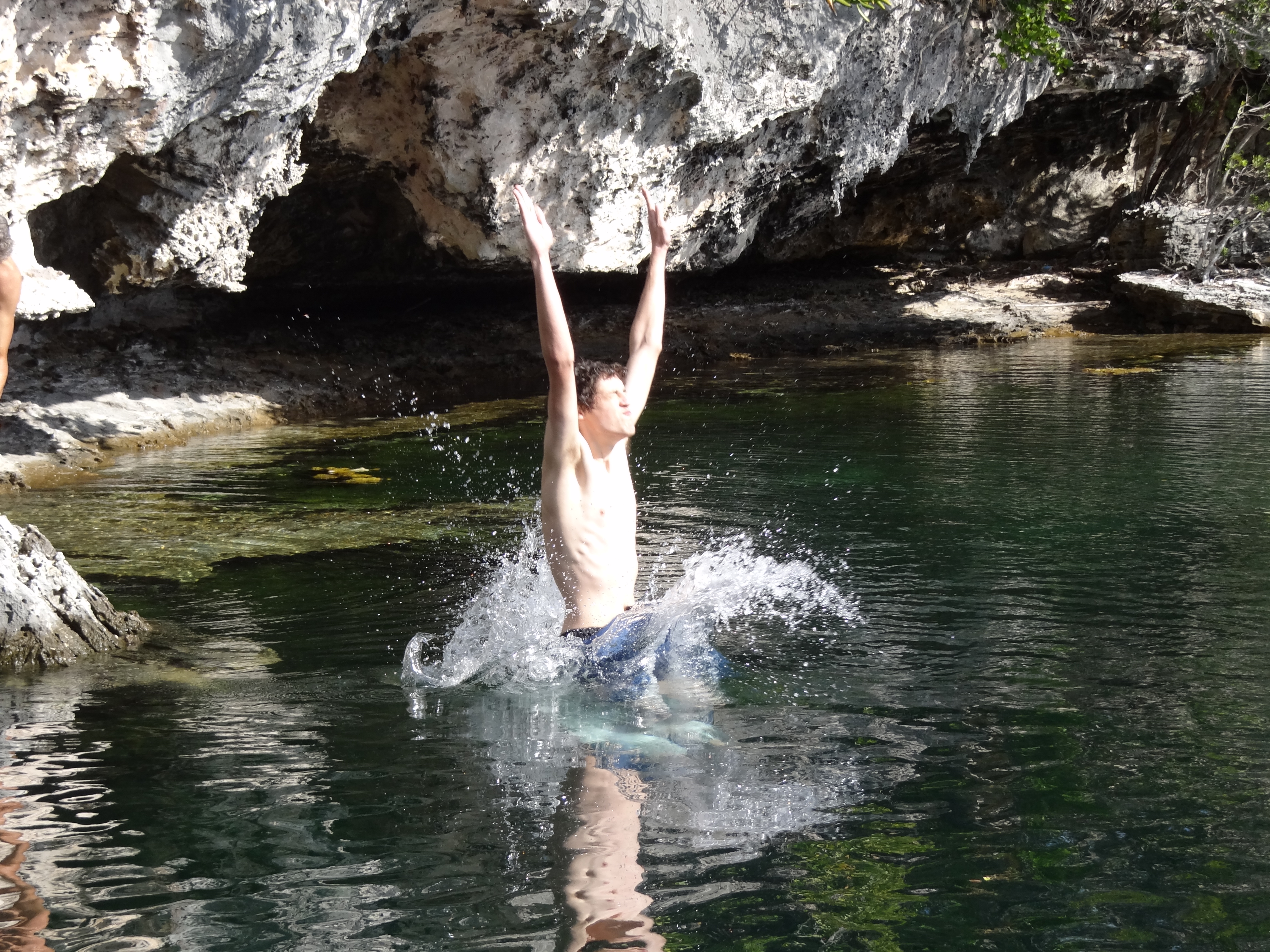The path ends right at the edge of the overhanging rock platform and as you look down, no way is that jump only 25 ft. Scoot down the tiny path at the edge to water level. Look up and declare, “oh, that’s not bad at all.” From above, the 25ft appears more like 50, while from below it seems more like 20ft. Benj can attest to a screamin’, exhilarating 25 ft jump that feels like 50! Russ remained in the “not brave adult” group and me- what else, I could barely look down and remained a dry photographer of the blue hole swim and float outing.