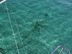 The non-existent wind caused us to bob about like a cute yellow rubber duck in a tub. With no pull on the chain it formed into a nice figure 8 design and for a while were floating over the anchor itself. Watching anchor behavior when we first drop it is a new experience. The bottom is sandy here, as you can imagine, and ranges from med-hard to hard (or scoured) and grassy sand. The grass is shorter and less dense than the dangerous stuff found in Florida; so even if you are sort of anchored in it, the holding is decent. Best to avoid grass though.