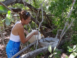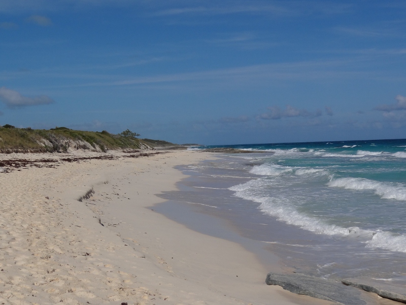 Sundays are old-fashioned here; businesses are closed except for eateries or a market open half day. We took a day off from the road trip into town to scout the trails on Sand Dollar Beach. Near the picnic tables an easy-to-walk sandy path winds its way across a narrow section of Stocking Island over to the ocean side. The foliage and short palm trees create a canopy that allows enough light in to see yet provides protection from the sun. Some kind person set up a bird bath in the trees with extra water jugs nearby. Instructions on the jugs say to fill the bath when M.T.