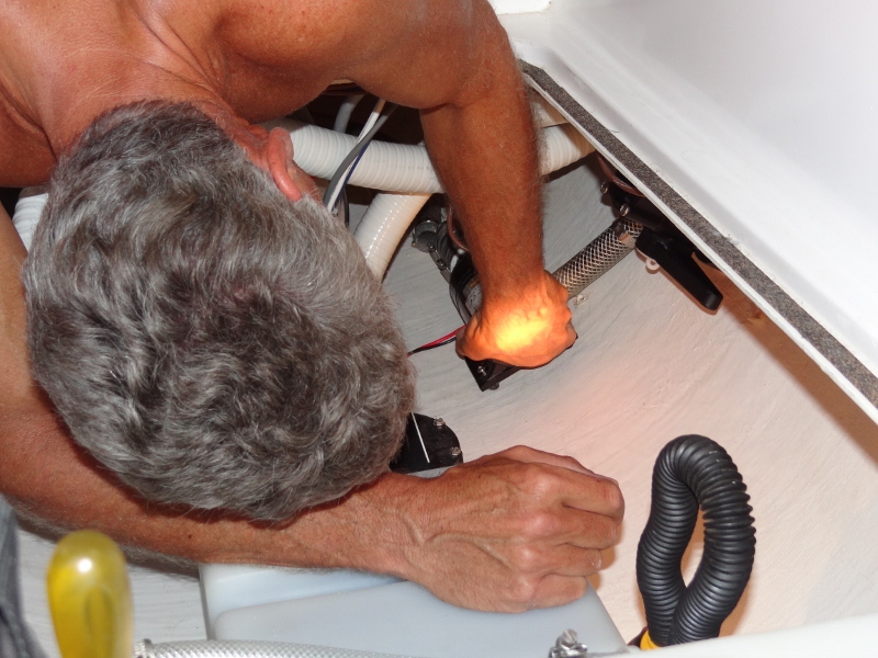 Our SHURflo shower drain pump was under-performing. So, Captain Russ, long overdue for a meaty boat project, removes the thing and lo-and-behold the macerator cutting blades inside are completely wrapped up in a wad of hair- not mine- noooooooo. Ah, remove that wad and problem solved, right? Back in to the bilge it goes and Russ silicones a round piece of screening under the drain. The next day we take showers and guess what? Problem not solved. Russ switches it out with the never-used one from the “guest” shower and further dissection shows 2 broken impeller vanes in the next chamber. No obvious cause for the break, but a replacement impeller will not be expensive.