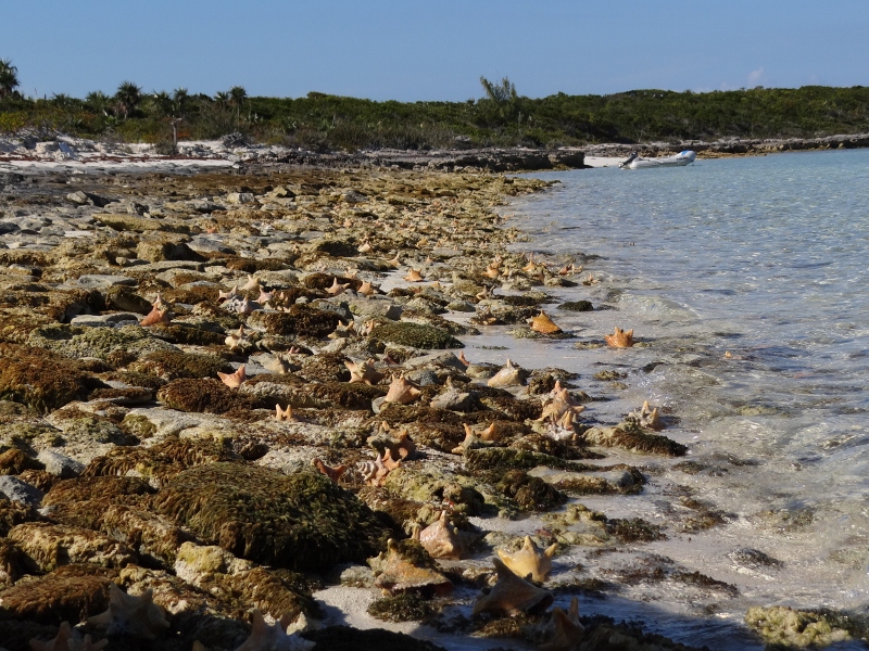 Saturday, near low tide, we ventured over to Pipe Cay’s northeastern shore/beach and came upon the mother lode of young Queen Conch, a veritable conch nursery. So this is where they all were, we’d hardly seen any live conch in our explorations. The camera got a work-out to be proud of.