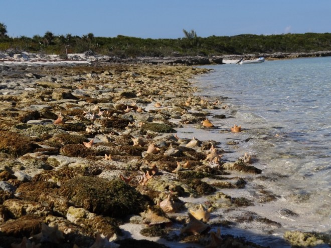 Conch life in a nutshell: conch are mollusks, along with octopus, snails, clams, limpets and oysters to name a few. They use a foot, a muscular organ, for movement- and yes they do move…. s l o w l y. The Queen Conch is the pride and joy of The Bahamas and the most numerous, although at the rate they are collected it’s hard to imagine any remain. Conch are found extensively in sea grass beds and sandy, muddy areas feeding on sea grass in relatively shallow water while the young ‘uns are found closer to the shoreline. So that’s what we came across, a plethora of young (less than 3 years old) conch living along the shore in mere inches of water at low tide.