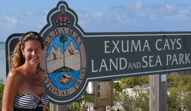 What we could do was to keep on the move every day and on Saturday arrive in the Abacos and be in Marsh Harbor for a shopping spree on Sunday. On the 9am Exuma Park announcements show we requested a mooring in Warderick Wells and were soon sailing along- very briskly today toward one of our favorite places in Exuma.