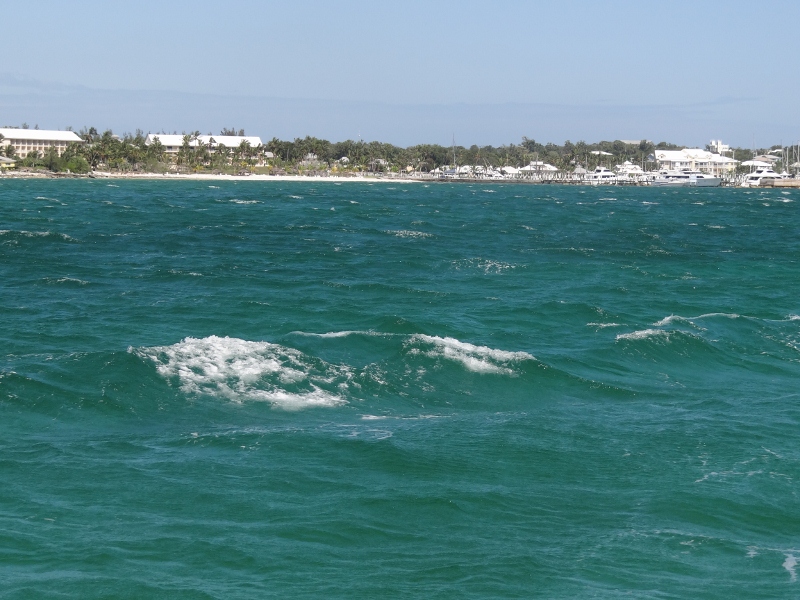 Marsh Harbor has a Cruisers’ Net at 8:15 every morning on VHF 68 and just like George Town, weather is the first topic. During the day and just before the squall line, several reports, warnings really, were made on 68, but a look to the west and you couldn’t miss the dark clouds approaching. The squall line brought a quick change in wind direction and we swung 170 degrees from SSW to N in an eye blink, the drag alarms sounded because we’d moved more than 200 ft, the rain poured down and the wind gusted to 35, max. Places west of Great Abaco gave reports of 70 mph. The temperature dropped to 68 from the afternoon high of 81.