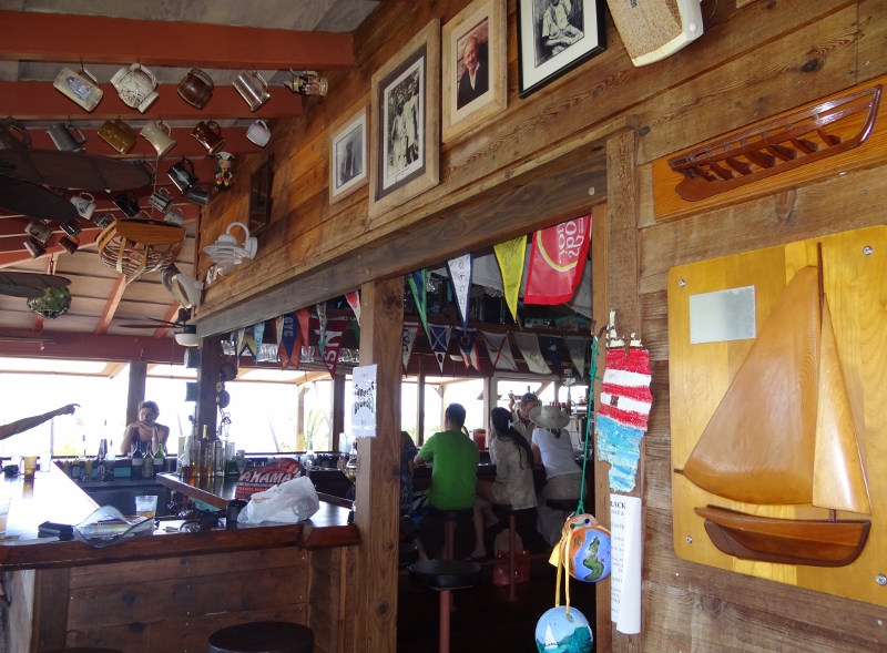 First stop this day (Sat) was Cracker P’s and a trail walk across Lubbers Quarters to the beach on the west side where you can look across the wide expanse that is Lubbers Bank (read: shallow) toward Marsh Harbor. Cracker P’s is tree top dining in a casual open-air atmosphere that we missed five years ago and made sure to grab lunch there this time.