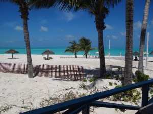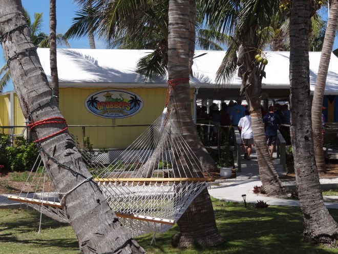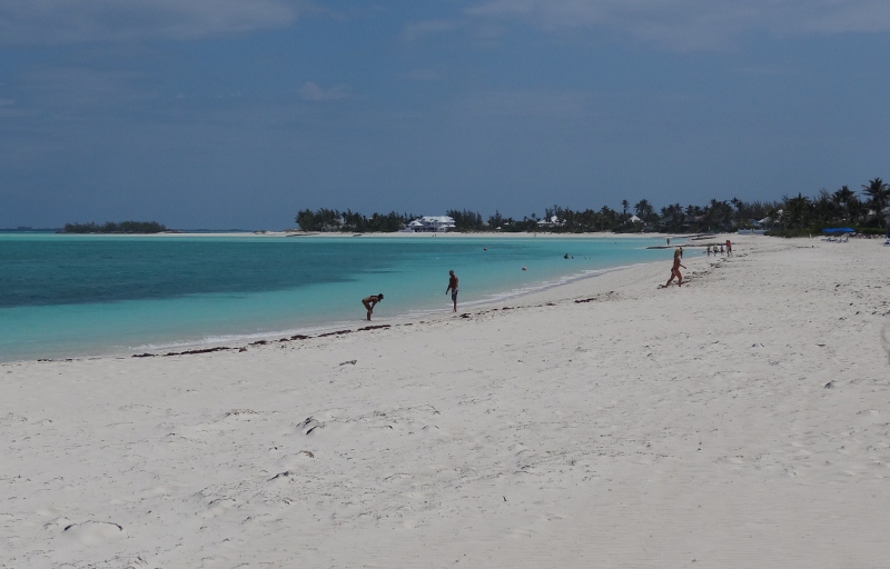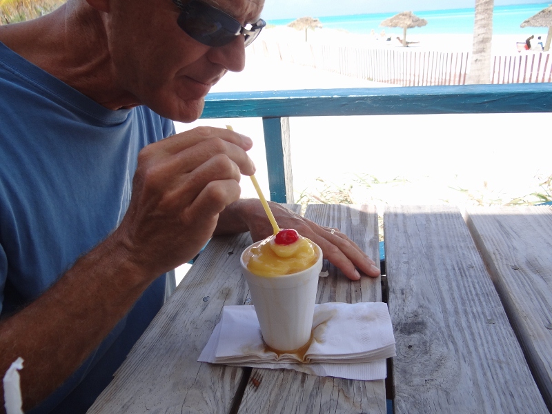 Treasure Cay’s claim to fame is its nearly 3 miles of beautiful beach and pristine shallow water edged by a wide band of white sand. It also boasts a well-known golf course and airport. On the way from Guana Cay, we detoured to Cistern Cay for a possible snorkel, but it was a bust. Tuesday was Russ’s birthday so we said “let’s have dinner at Spinnakers.” Wrong. Treasure Cay Marina has 3 places to eat (not much else around) but not every place serves dinner every day and Spinnakers doesn’t even serve lunch. Soo………….. Tues is BBQ on the beach across the road, at Coco Bar. Sounded fine and we even ate lunch there after a beach walk so Russ could indulge in the frozen mango daiquiri we’d heard about from Sojourner. A thumbs up from the ancient mariner 🙂