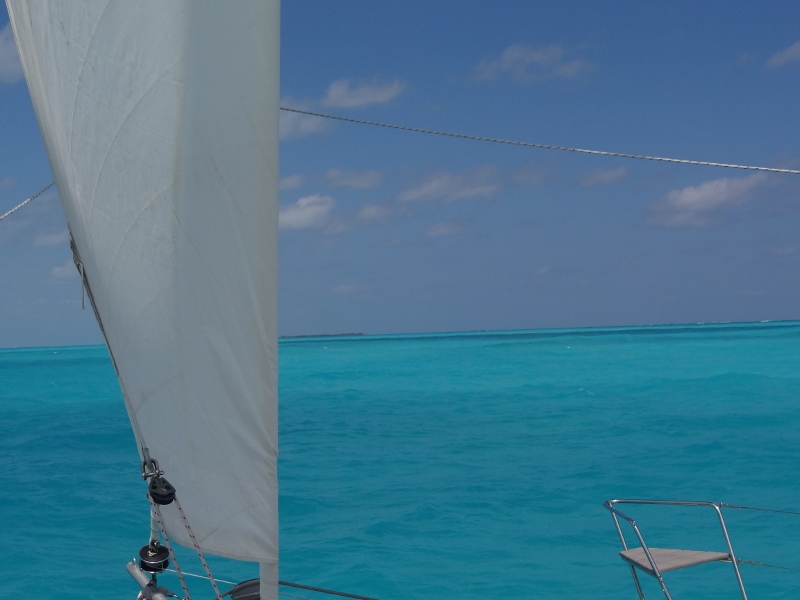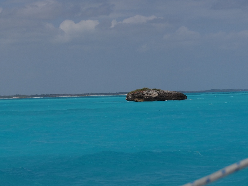 I’ve jumped ahead a bit, so let me step back to our trip here from Hope Town. An accurate forecast gave us a pleasant, non-tacking sailing day of 27 miles- past Marsh Harbor, past Guana and Treasure Cays- and past the dreaded, double whammy Whale Cay Passage. In the Sea of Abaco one needs to pass through a large shoal area either by using the “Don’t Rock Passage” or the close to shore inner route. Most vessels, however, must make a jump outside Whale Cay which involves transiting two cuts- one out and then back in. This is one of the most notorious passages in the Abacos and one you do not take lightly. With our draft we can avoid that nasty out and in route and instead opted to do “Don’t Rock Passage” which is roughly in the middle of the Sea between Treasure Cay and Whale Cay. This occurred near high tide, with me watching at the bow. The swells still sneak in from the cuts; I had tightly clenched hands on the rails all the while. The lowest depth we saw was 4.9 ft with depths mostly in the low fives. Beautiful and eerie at the same time.