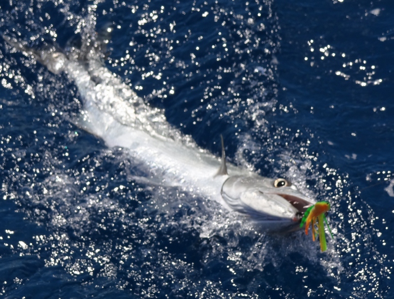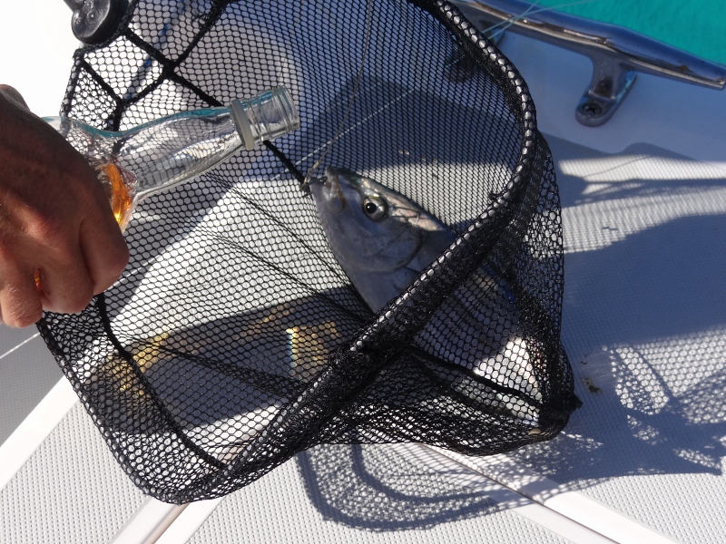The wind gods and goddesses blessed us Friday with the longest, most comfortable day of sailing this entire season and King Neptune even offered up a couple of his denizens…- yay! we caught our first fish- a near miss second (tore the lure and bent the bungee cord hook) and a barracuda third, who we let go. After the obligatory photos, a drink (for the fish,- hey it was a BAR Jack), Russ prepped the Bahamas Runner, aka Bar Jack for dining- all 13 ounces of him! So the filets were tiny, but they tasted so sweet and delicious, I was amazed. Kudos to the Captain who left not a single bone in those tiny filets.