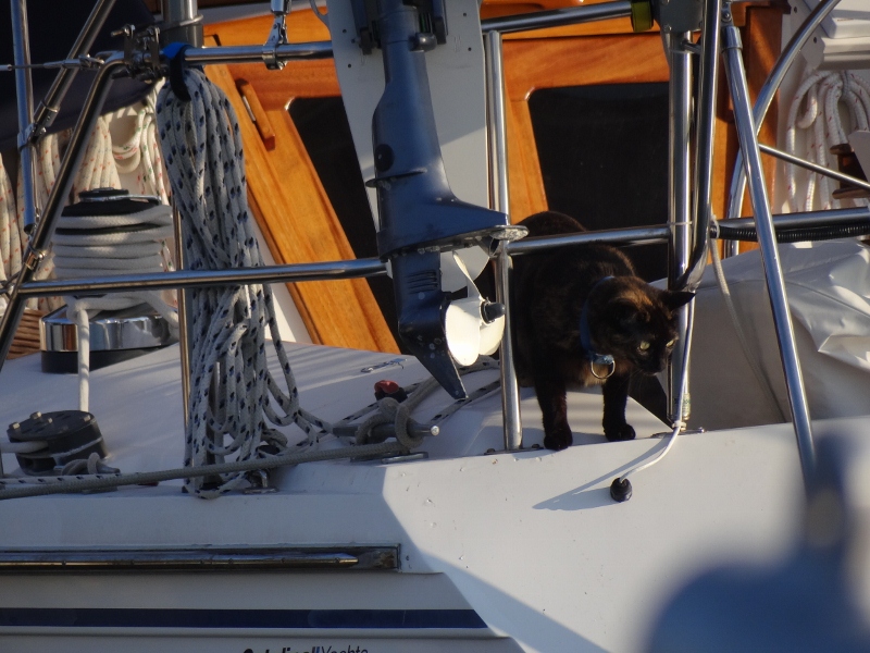 We expertly timed our arrival on Monday so that moorings would be available and we snagged #34 all to ourselves for the entire stay. Each night the 57 balls were full, many with 2 boats rafted. The slips stayed full too. The boat next to us ended up with a raft partner who appeared to own a cat. When all people were off the boats, curious kitty nonchalantly checked out the new boat. After these photos, never saw him again.