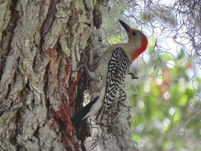 I stopped back later; alas no parrots. A red-bellied woodpecker pair made up for the missing parrots. The male popped into the convenient tree knot hole before I could get a shot, but I got the female (entire head isn’t red) who appeared to be doing all the work.