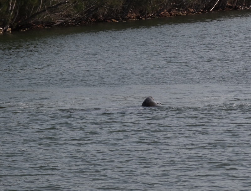 The Mosquito Lagoon is a stretch of the Indian River North and is oh about 10 miles long. The near glass water enabled us to see every ripple and swirl; dolphins and manatee sightings left and right, although I still didn’t have good luck with a picture. More than once we moved aside to avoid a possible manatee- much of the Lagoon is “minimum wake.”