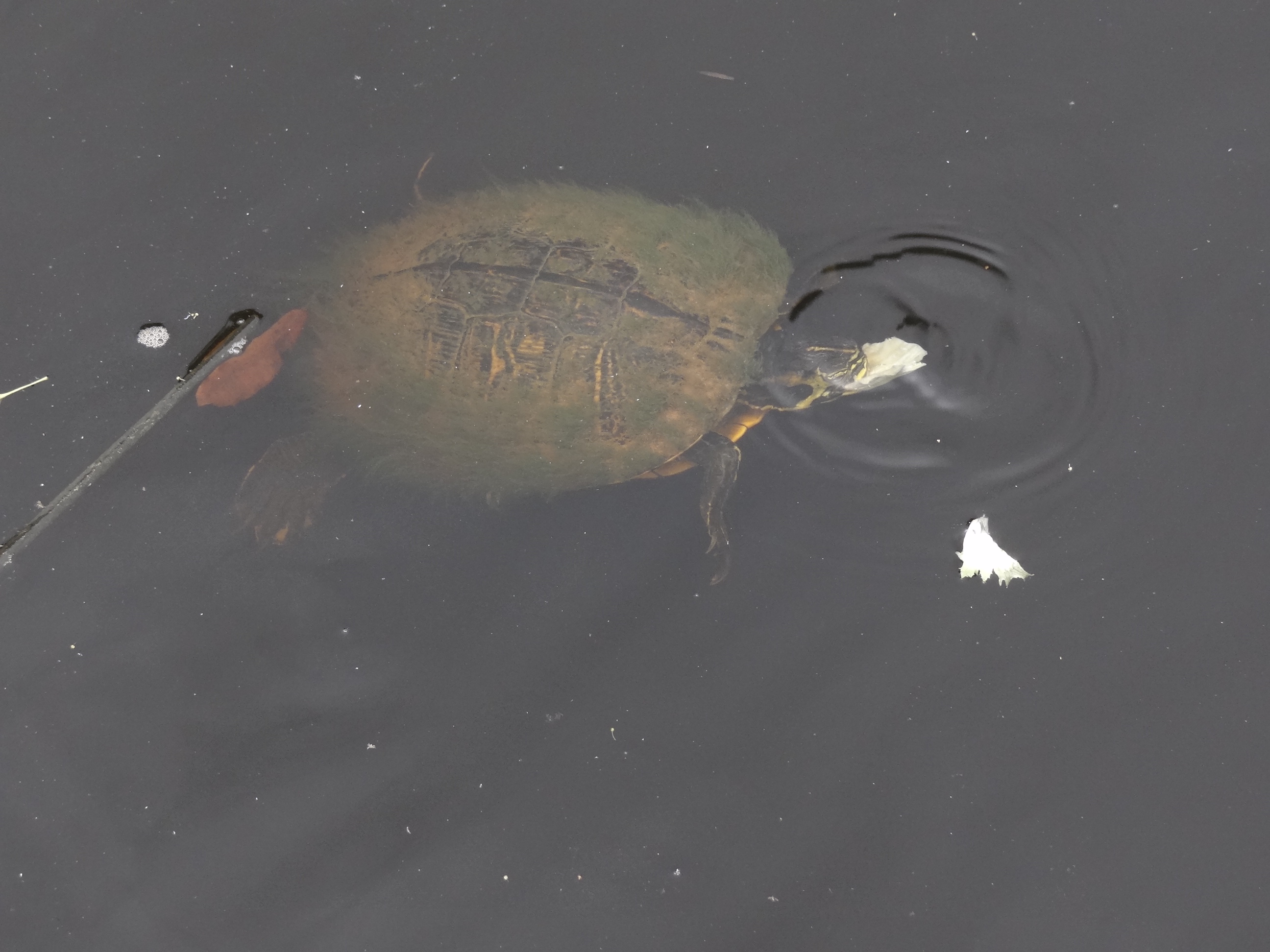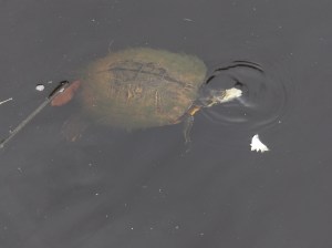 By some miracle, the blob skimmed by us and the next one turned out to be only rain, as it poured 2 mins after we got tied up at the dock. Mike of m/v Happy Hours V caught our lines; we eased in to the spot in front of him. Sunday’s forecast was for high winds and T-storms; none of that occurred. We decided to buy fuel and get a pump out; Osprey’s fuel prices are THE best and a p/o is free. I knew from last year that turtles hung around the fuel dock area and sure enough two paddled over to check us out. I raced to grab lettuce and…. “they liked it!”