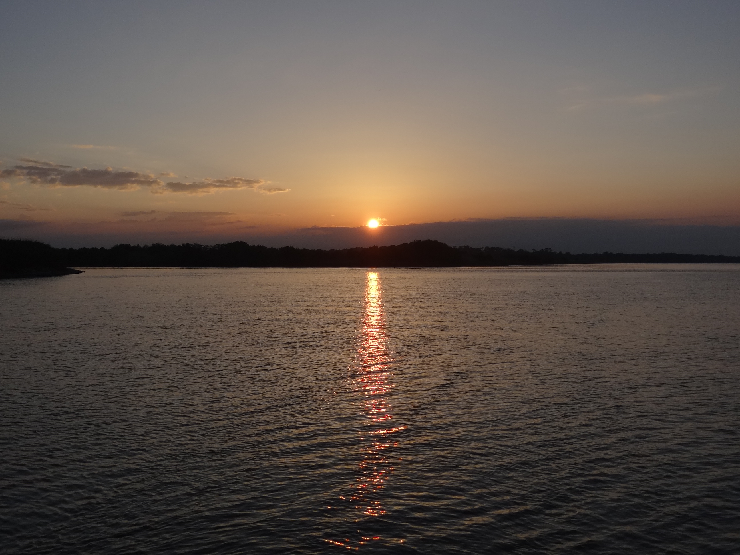 Too little wind, too much wind, too many T-storms, too few? Nah, never too few. One of the downsides to not enough wind is fog, which can make for excitement of the unknown sort. First, a word about our travel day between Charleston and our anchorage in Winyah Bay’s Western Channel, just a stone’s throw off the ICW. Another lovely marsh-lined stretch, much of it through Cape Romain Wildlife Preserve. One is almost guaranteed to spot a bald eagle or two, not to mention the ever-present dolphins, egrets, herons, seagulls with an occasional jumping fish. I completely understood how Alligator Creek received its name, when not 100 yds before coming upon it, I spotted a gator crossing the river.