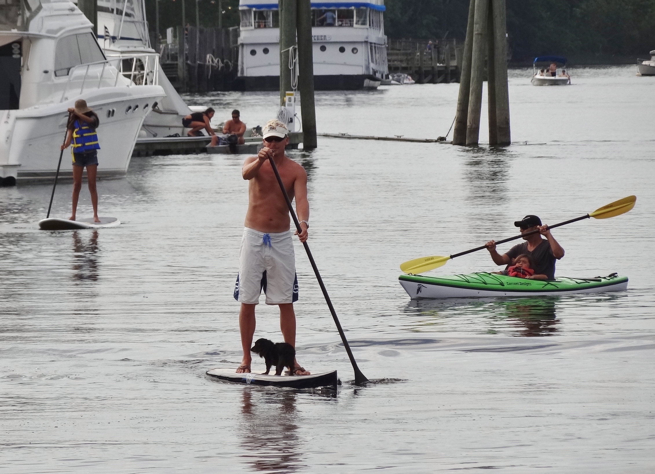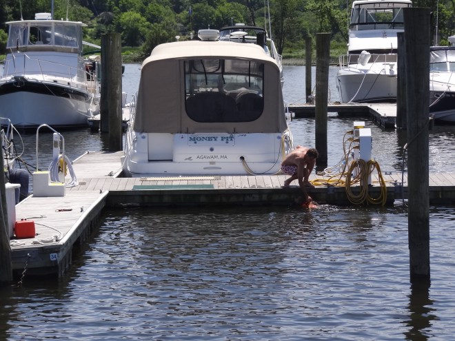 Now you might be wondering why so much concern when, hey can’t dogs swim? The answer is a qualified, “yes.” I’m the last person to discuss what dogs can and can’t do but I know why the dog owners here are cautious: it’s the current. A small slice of the CT River veers off behind Eustasia Island, creating a quieter side leg where the marina is located. The current makes docking a challenge at times; even departing at slack tide is no guarantee of a collision-free maneuver!