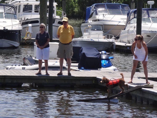 Unless it’s slack tide, anything, including Fido, which finds its way into the water, is going to move along, most likely toward the floating docks. Logs, branches and other flotsam get lodged under the floating docks all the time; spring time is the worst. Sooooo, depending on your level of concern, your dog’s ability to swim and level of clumsiness (ok, is “excitement” a better word?), that pooch is parading along the docks in a bright yellow or red doggie life jacket; or not.