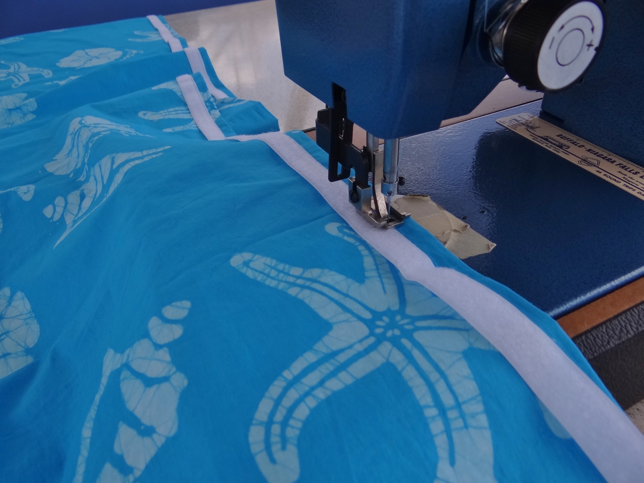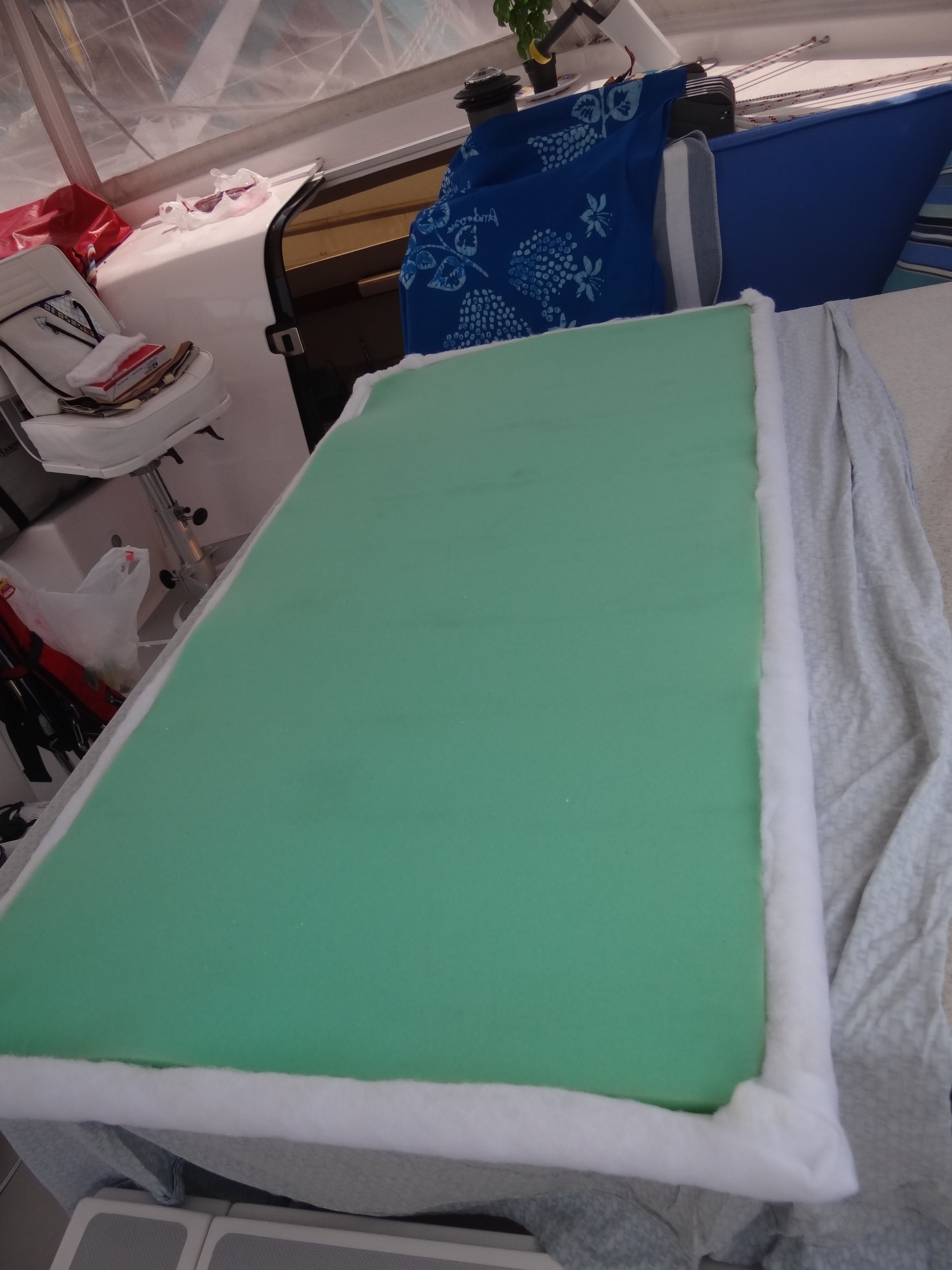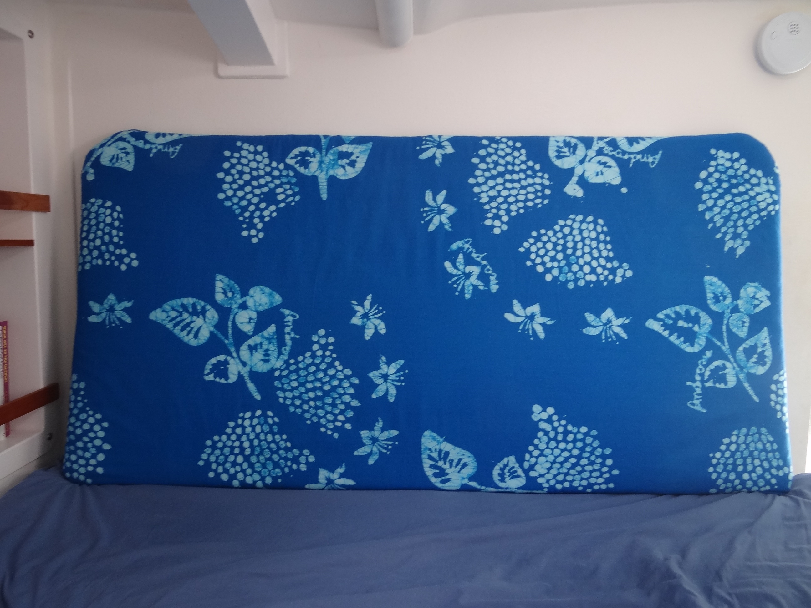 Moving along to interior decorating-not that I don’t like sewing Velcro, but let’s face it, curtains and a headboard are far more satisfying. In George Town I bought Androsia fabric in two colors- made guess where? Andros Island- the largest Bahamian island that almost no one visits. The darker (medium blue) fabric I used to make a headboard for our bunk. We constructed it from ¾” PVC, using 90 degree connectors at the two bottom corners and two 45s at each top corner. For added strength Russ put dowels inside the top and bottom PVC tubes. A 1” thick piece of 24”x48” foam rests inside the batting-wrapped PVC frame , then the fabric covers the batting on the forward-facing side.