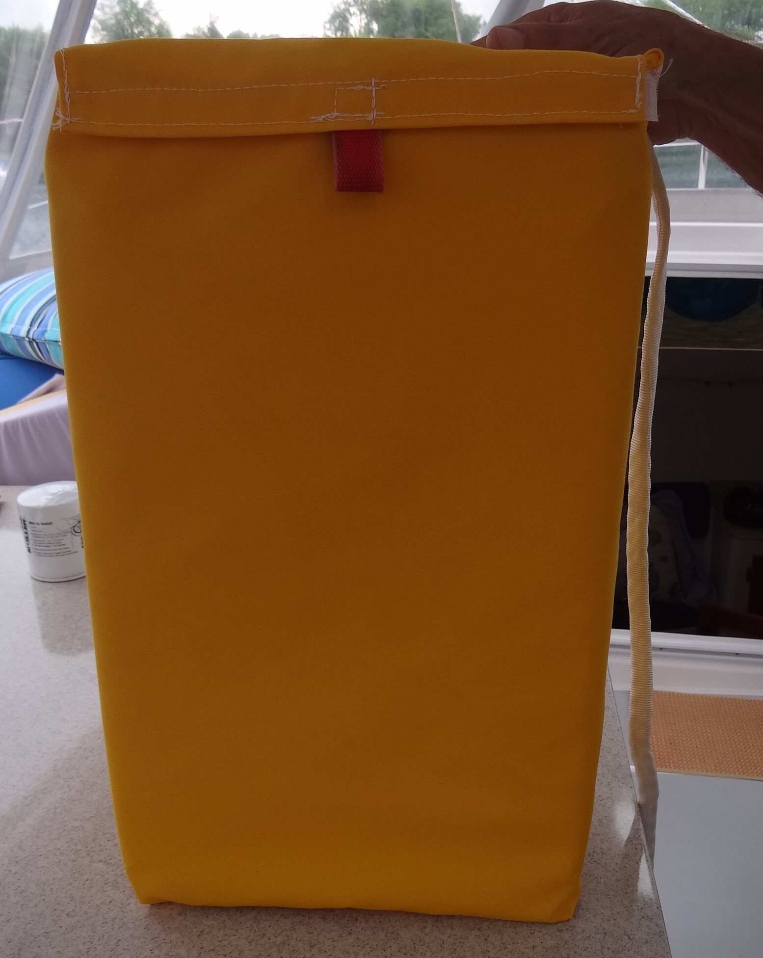 With that, I thought for sure I was done. Alas, the Captain ever vigilant noticed our Lifesling bag was looking, well, extremely faded and I had to agree. I ordered a yard of 45” wide Sunflower yellow Sunbrella marine grade fabric from my favorite supplier of all things sewing and I less than a day- voila! a new cover. I think I’m getting the hang of all this- what should I call it?- non-garment sewing. Since my first Singer machine at age 13, 95% of my sewing was clothes; piping was not in my vocabulary.