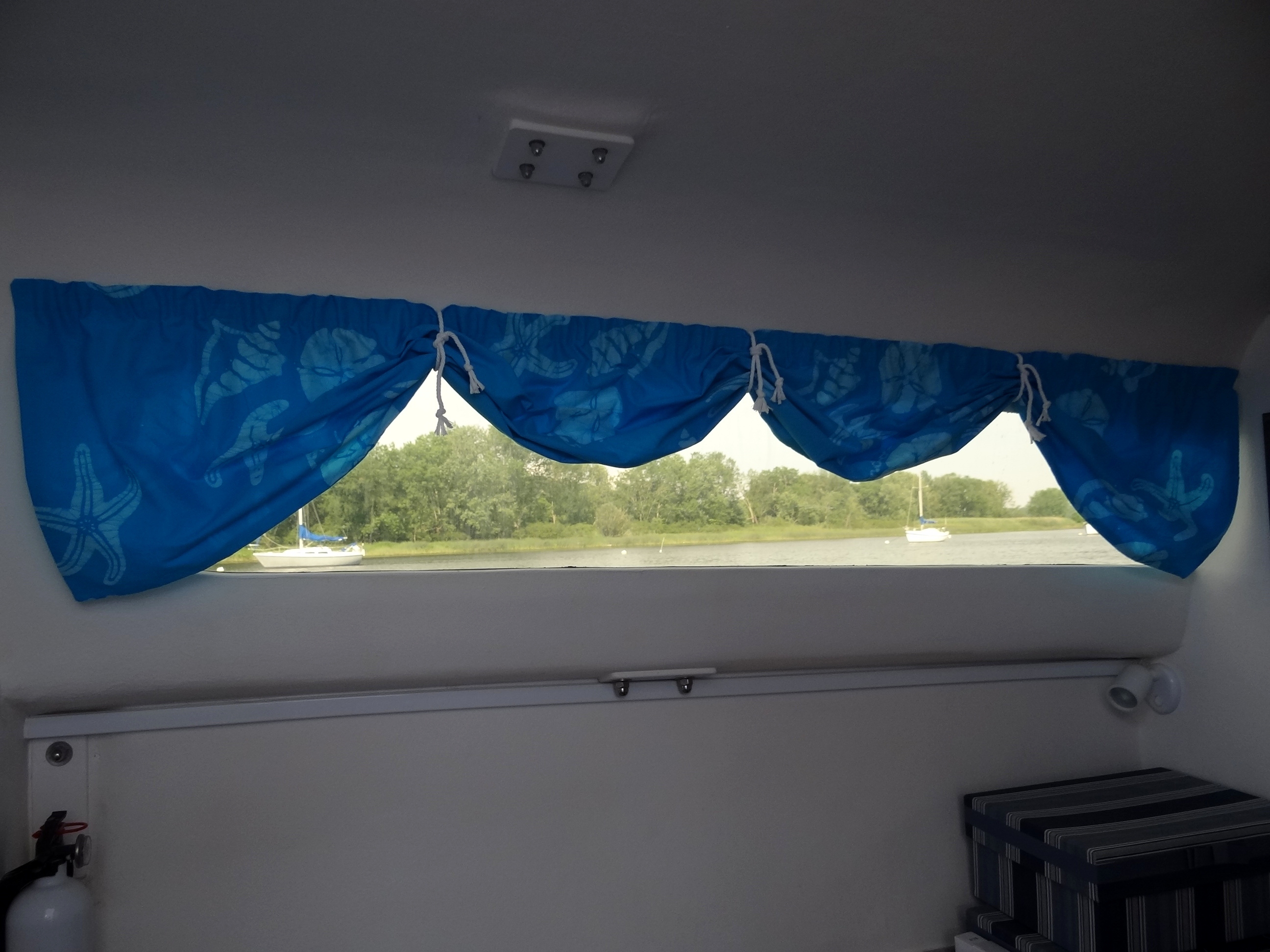 The curtains are another easy sewing project; just a bunch of rectangles with Velcro sewn at the top. We didn’t want to make another hole in the boat or spend much money,so… we kept it simple. Last summer I made a curtain for the window next to the bunk on the port side so Benj could have privacy at night. We used self-adhesive (hook) Velcro on the wall (the glue didn’t work) and I sewed the loop part along the top of the curtain. I made the curtain longer than the window so it could be gathered a bit. When we leave CT I tie it up to let in more light. That curtain worked out well so I did the same on our side, for both windows and with unplanned extra I made shorties for the galley.