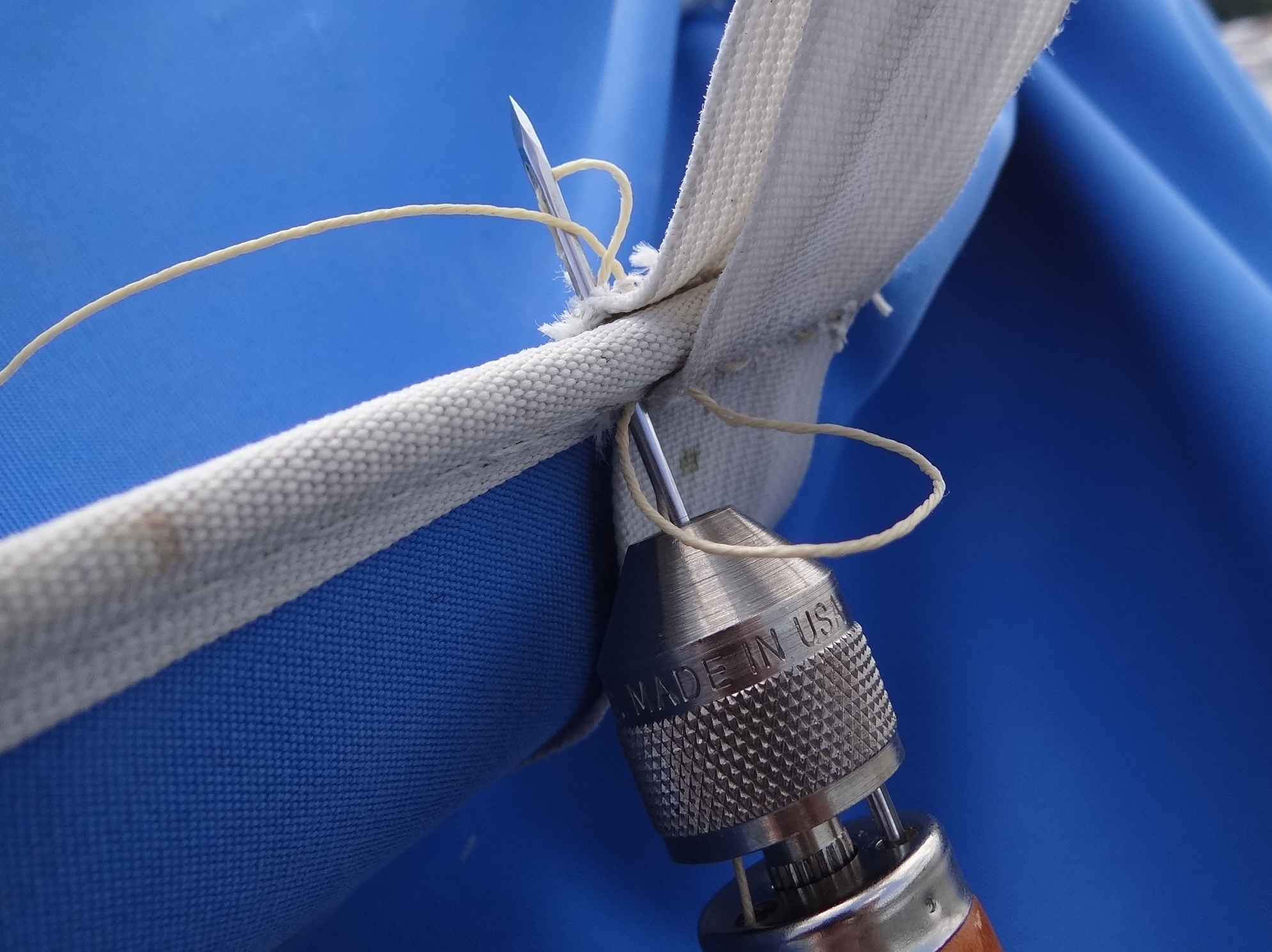 My prior order from Sailrite included a clever gadget called the Speedy Stitcher Sewing Awl. I watched the how-to video and now own a device that is “sew” the opposite of the Ultrafeed. Designed for repairs that you can’t do with a machine, it is simplicity itself. The needle is sharp as hell; I left “Lori was here” marks on both sides of the stackpack support straps. The stitcher comes with thick waxed thread and two needles: straight and curved. I bought fine waxed thread and a thinner needle to use for that and the V-92 polyester thread I use for my Sunbrella sewing.