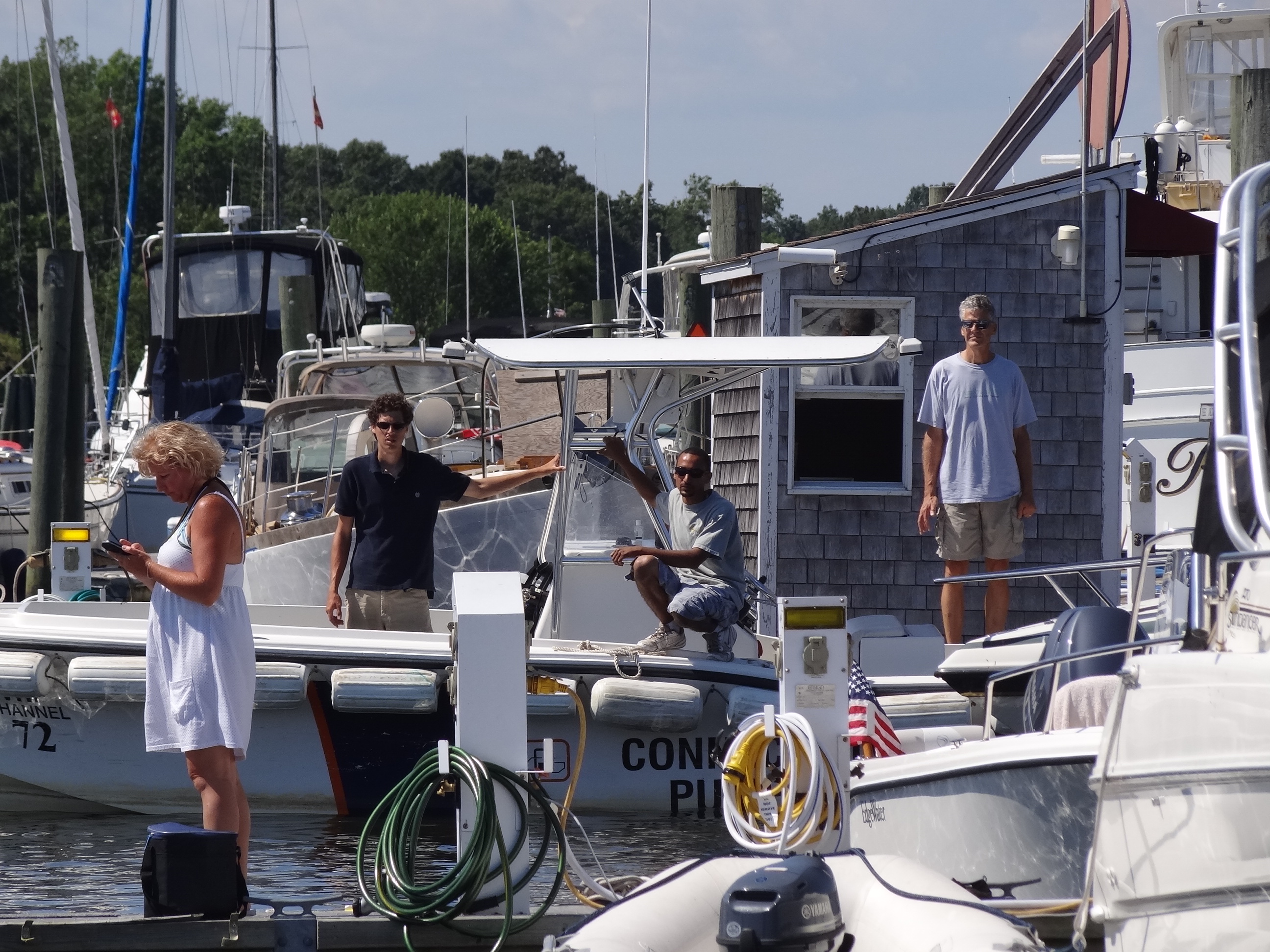 The following weekend we see owners and guests preparing to head out, most likely to Hamburg Cove. Roughly two hours later the VHF comes alive with some frantic sounding words, the local Fire & Rescue crew comes hurrying down the dock and we see a power boat zooming into the marina, clearly not obeying the no-wake signs. But hey, isn’t that the Essex police boat behind them? Uh oh, sure enough Todo Bien is heading for the fuel dock, which has become crowded with marina and rescue crew, pump out boat crew and curious boat folk.