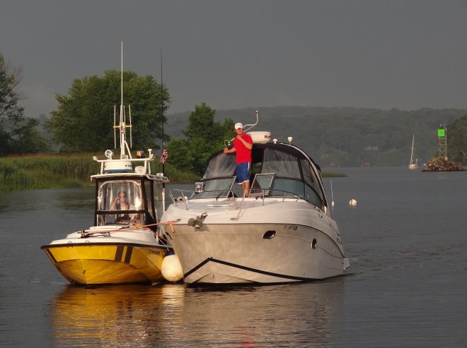 A few weekends later they headed out further than they typically go, to New London. They joked when leaving that if they didn’t come back, to come look for them. The trip out was uneventful; however the trip back became “event #2”. The Thames was busy that day, the day after the huge fireworks display and Todo Bien somehow lost the use of one engine. Limping back toward Old Saybrook and the mouth of the CT River, they kept closer to shore to shorten their traveling distance. Bad idea. Somehow they managed to confirm the location of a charted rock and that took out the second engine. Didn’t hole the boat though. SeaTow brought them back home safe and more than a bit shook up. On Monday the marina work boat came to bring Todo Biento to the travel-lift well and a week later brought her back all shipshape.