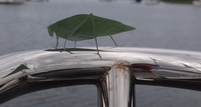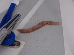 The birds have been active, swooping around carrying and dropping an interesting variety of objects. This year, at least, we didn’t have the sparrows repeatedly trying to build a nest in the end of the boom. The seagulls become active several times a day when they are dining out. One morning Russ pointed to the port bow. What the heck was it? A large slug, a huge bird turd… no it was… eeeu- the tail end section of a snake. Skinned. Pinkish. A one inch piggy-bank coin slot cut lengthwise in its side. We figured it got dropped by a seagull, same as the piece of dead fish we found soon after, on top of the cockpit roof. Food fight!!!!