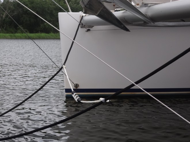 Laundry; groceries; regular trips to storage, mail store, Defender, West Marine, boat cleaning and fix-it projects seem to consume a huge chunk of our “non-working” time. I thought this summer would find us with fewer projects; not so true. One fairly easy project was to set up a snubber for our bridle. This would provide stretch when anchored in windy conditions, as well as help keep the bridle away from the dolphin strikers.