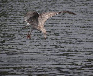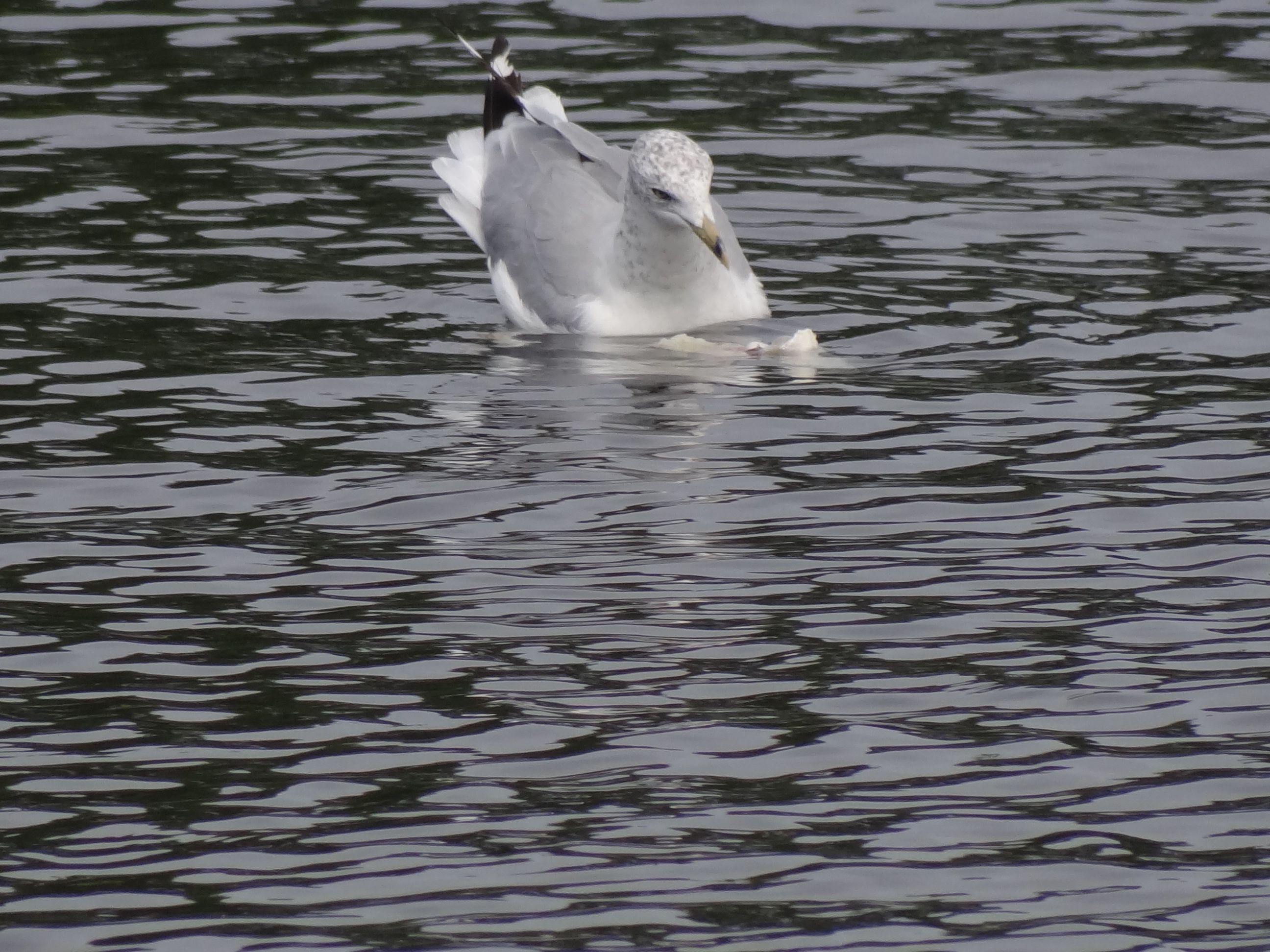 Yesterday I was at my bird watching station (reading at the stern) when the seagulls began screeching; one drops his prize in the water and he and his buddy appear to be indecisive about their next move. Well, the large fish that jump and splash all day (ok, maybe just at eating time) sure knew what to do. In between grabbing the camera, trying to focus and still keeping an eye on the action, I watched as the fish snagged a few bites from below. The gull made a valiant effort to get his share, but in the end not much of the fish- or whatever it was, remained for seagull food.