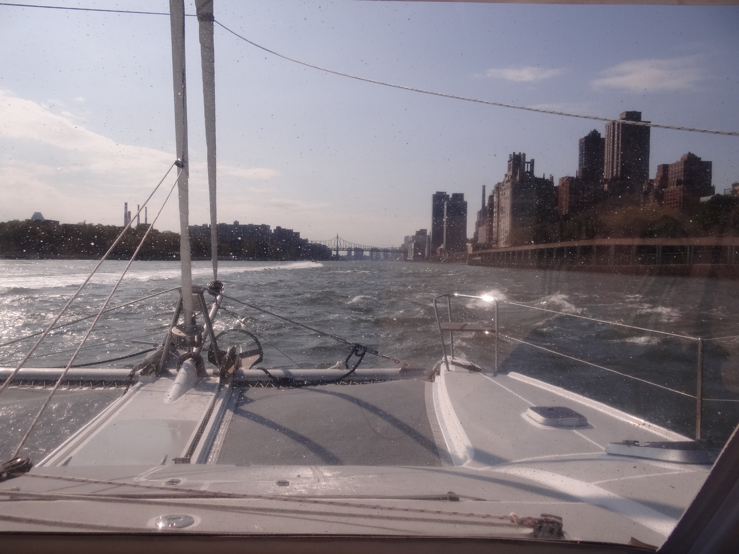Sun Oct 14:1 star in the morning, 3 overall. The trip down the East River, through the city , ending up anchored at Atlantic Highlands, NJ. With SW winds 20kts plus, LIS became the antithesis of its Saturday self. Our waterproofing efforts were no match for the largest wave ever to come over our bows. We nailed Hell Gate at full current and actually touched 12kts for a second. The river was swirling like crazy and with the day being Sunday, the speed boaters joy–rode through that stretch, looping around and around.