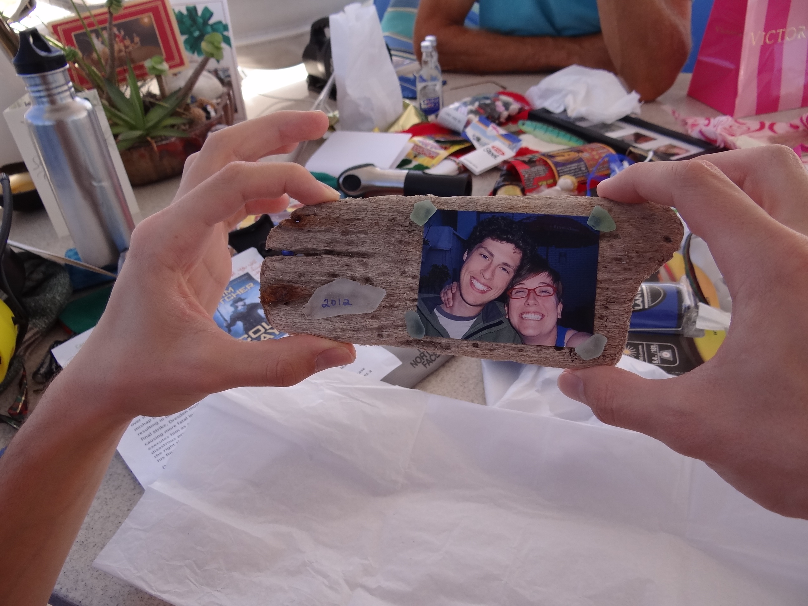 Now, we knew where our plaque should be because the captain said to check the picture we’d taken so we could find it again. Good thing. We looked, and looked and finally, down near a large rock at the bottom of the pile sat our plaque; one end broken off and looking very much like a crumbling piece of driftwood. The date got carved and the pieces placed back on the cairn of wood.