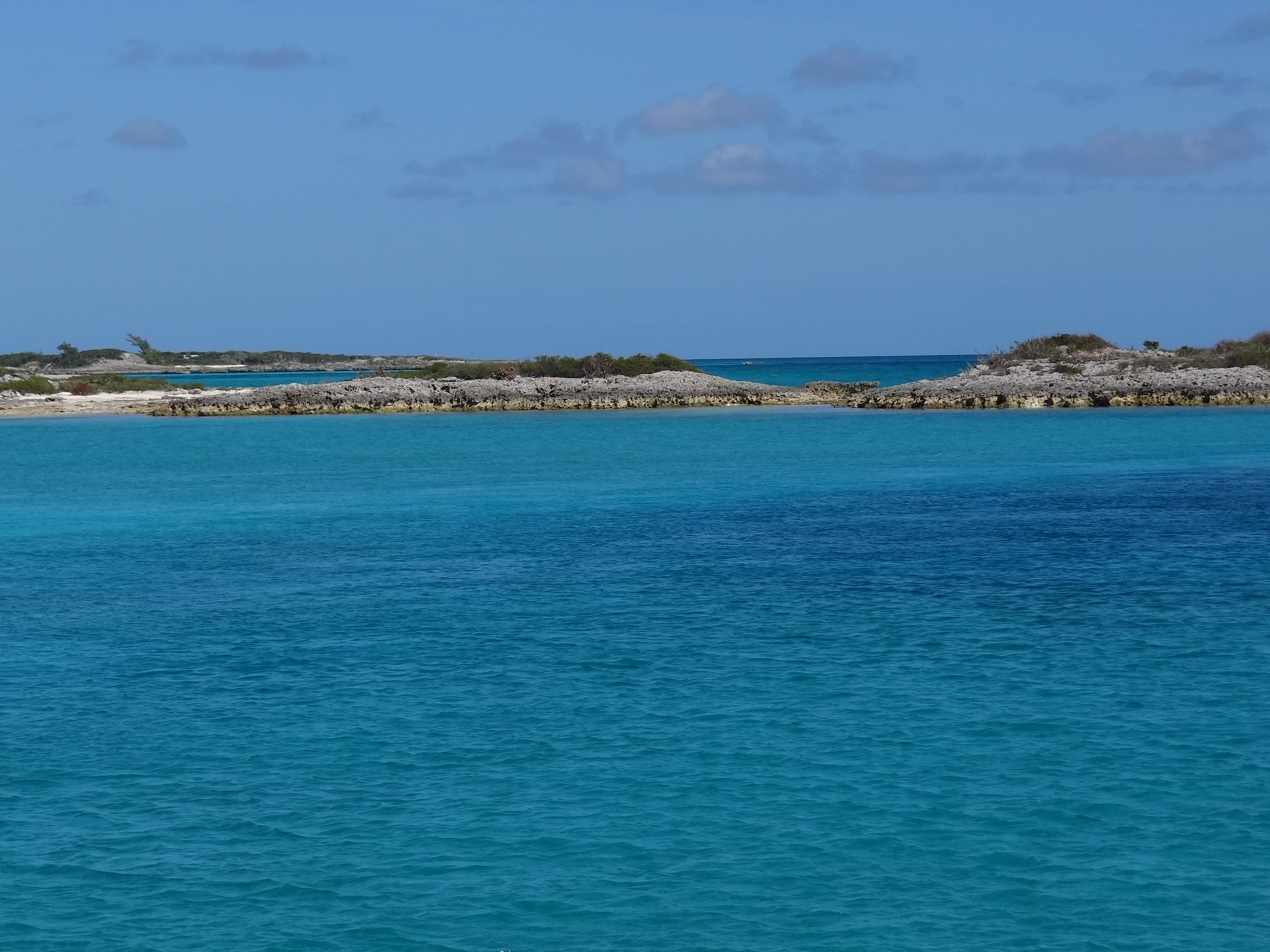 Next stop- Shroud Cay a six-mile motor in flat, clear blue water. 18 ft looked like 6. Not even a ripple except the ones we made. The bottom was sand with scattered turtle grass, a few soft corals even more widely scattered. A couple of Nurse sharks swam by or maybe we went by them; hard to say. Although Shroud has moorings, the bottom is sandy and the holding good. Most boats were anchored, including a few larger yachts with their PWC toys.