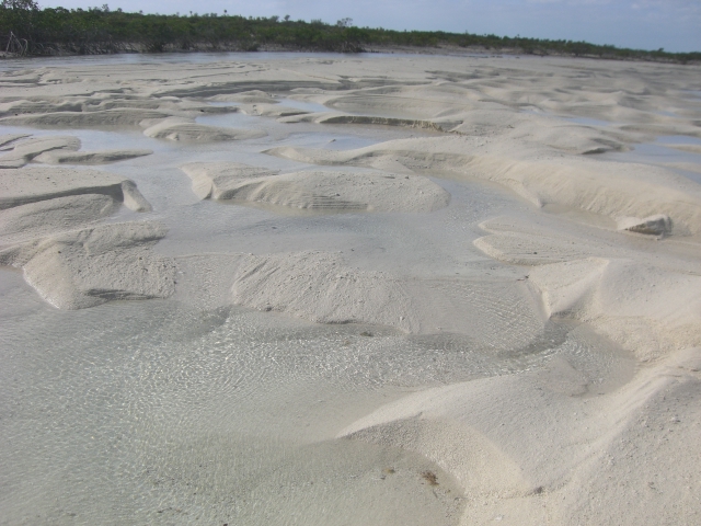 Sunday we enjoyed a brisk sail of nine miles down to Big Farmers Cay. The chart showed a good spot off a sandy beach- protected of course from SE winds-that was a mile away from Galliot Cut should we decide to leave Monday for George Town. Beach combing is always a top priority and this spot proved out better than it looked. We found lots of broken young conch shells and I gathered up all the really nice pink pieces. Found a creek at the far end of the beach, nearly dry at low with really interesting water marks left in the sand. Lots of good driftwood there too, most of which I left for someone else.