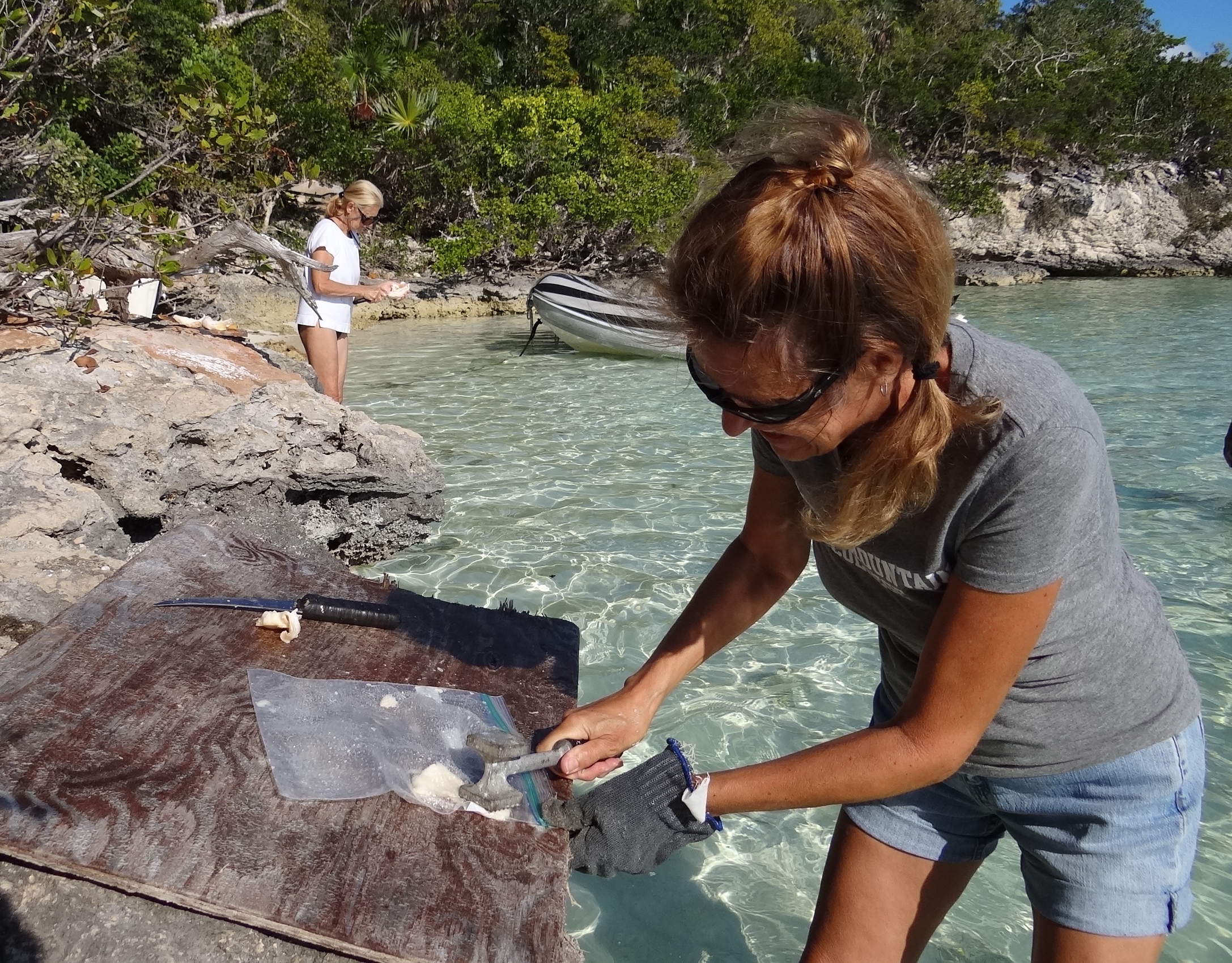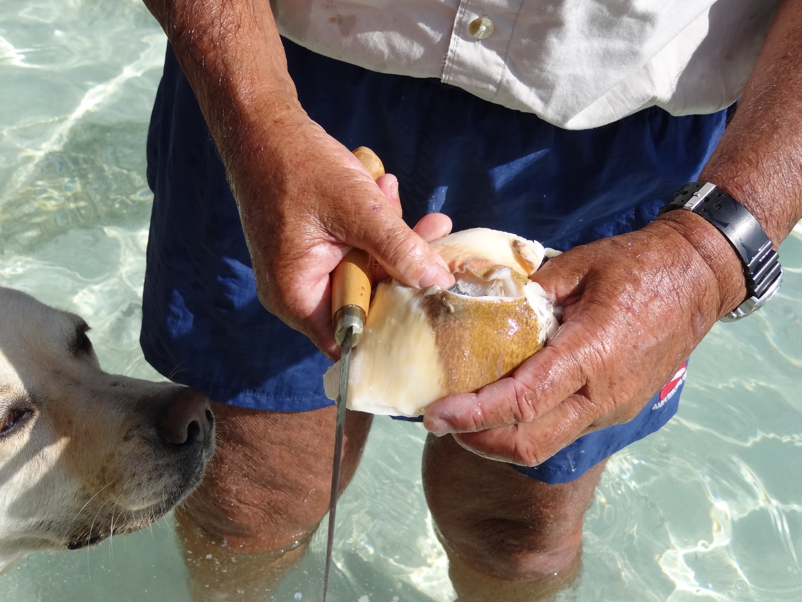 Steve told us to bring sharp knives and large Ziplocs. Newbies at this process, we imagined it taking place on the stern, but as we approached our instructors jumped in their dinghy and off we went… to the perfect conch cleaning place and sheltered from the wind too! Fast learners- for sure our middle name. Steve explained how to determine apprx conch age then showed us how to extract the conch.