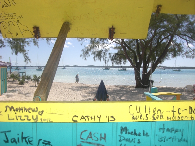 Looking outside, the snow has melted to a fraction of its depth last week, as I reminisce about my timely winter get-a-way aboard Ortolan in the Bahamas. An adventure right from the start, with 3 plane transfers, customs clearance, taxi to downtown George Town where I would meet my gracious hosts, Lori and Russ, at “the dinghy dock behind the market”, for a short dinghy ride to the mothership in Elizabeth Harbor. It was dusk and still the water was impossibly clear and the temperature so WARM!!! OMG how easy it was to relax and settle into the Bahamian/Cruiser laid back lifestyle!!