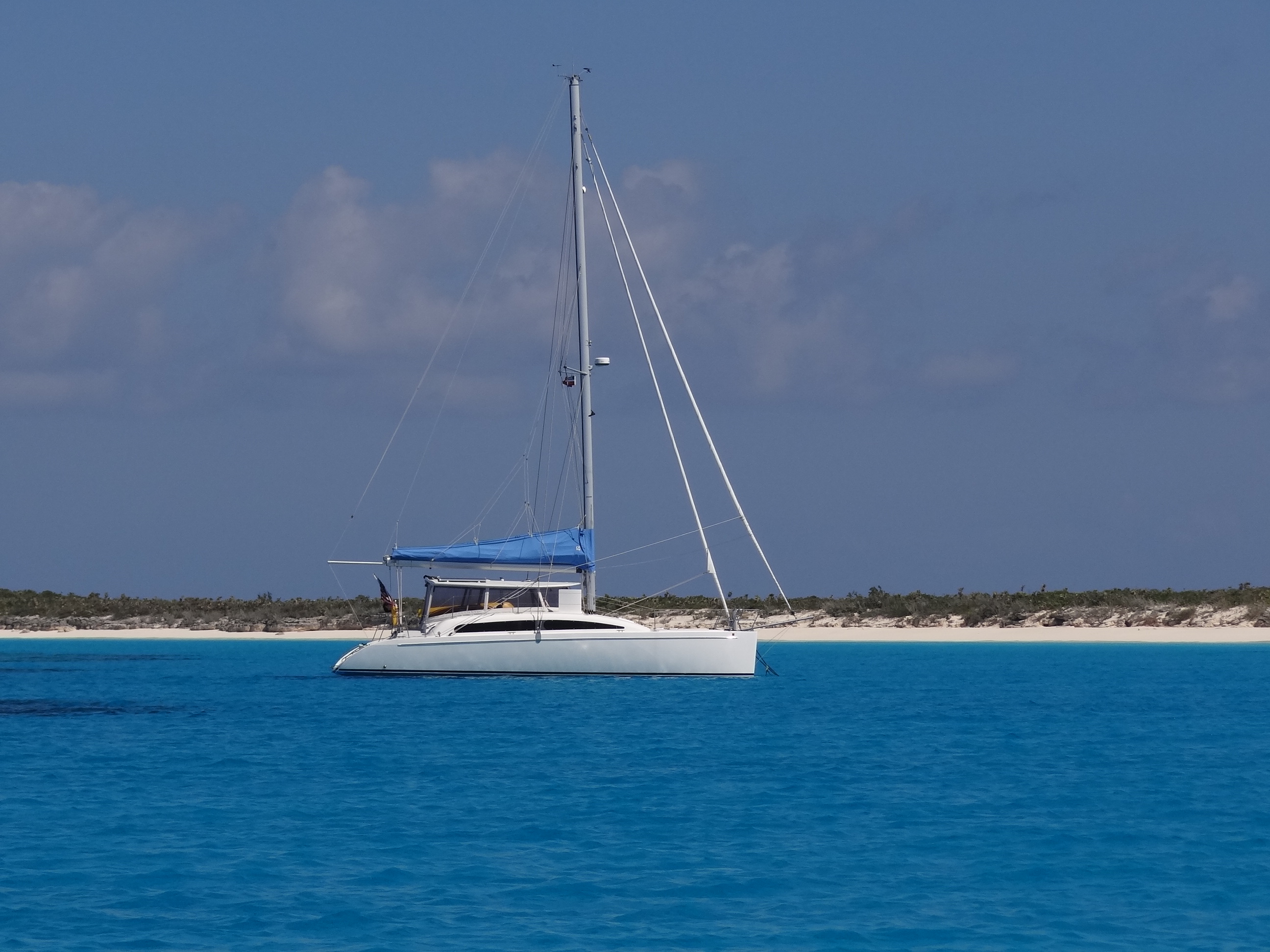 This beautiful island nestled in the Far Bahamas is described in our Explorer Chartbook as”…paradise within paradise in that it is preserved in its primitive natural state as part of the Bahamas National Trust. As more “armadas” of boats escape for a sojourn from the fleet at Elizabeth Harbor and discover the beauty….” The island lays 15nm NE from the tip of Long Island and 50nm from Elizabeth Harbor. The only anchorage in prevailing easterlies (NE – SE) is West Bay and it can hold a generous quantity of boats. Your typical cruising vessel is not the only creature to be drawn in by the magnetic pull of remoteness, crystalline waters, mangrove creeks and long-tailed tropic birds. We were very surprised to find two mega yachts and a stealth-like dark-colored boat the likes you might see in a Bond movie or a futuristic flick. Kinda ruined the primitive natural paradise view of things; until they all departed.