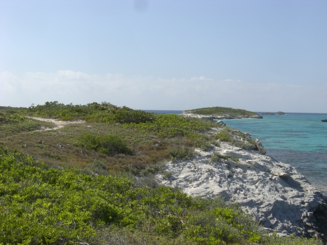 Two teeny problems. One, Russ twists his knee as we pull the dinghy up on to the beach. (sure sounds like we need a better method, uh?) Solution: he goes back to ice his knee, leaving me to beachcomb. Second problem: the beach I am on after I cross from West Bay beach to the ocean side, is NOT Babbies Beach. As I get to the southern end of the beach #1 I see that a path continues up some rocks (with a rope for help up) and that must lead to Babbies Beach. (could that be a made up name?) Solution: have water, camera, Tevas- will hike. Yes, me alone. Another dinghy was beached near ours and I didn’t see anyone nearby so I figured they’d trekked to Babbies and maybe I wouldn’t be totally alone. (wrong)